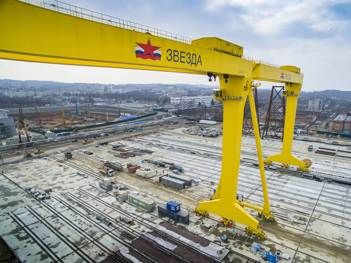 В сентябре 2016 года в Приморском крае состоялась церемония запуска первой очереди судостроительного комплекса «Звезда». Оснащение будущей верфи «Звезда» современным крановым оборудованием обеспечивает технологический цикл судостроения в Большом Камне. Новая верфь станет крупнейшей современной гражданской верфью в России, а также базой по созданию и развитию шельфового оборудования. Первые краны грузоподъемностью 320 тонн были успешно доставлены и установлены на площадке СК «Звезда» в августе 2016 года. Общий вес груза составил 1560 тонн. Тем временем строительство продолжается и происходит дальнейшее насыщение большого стапеля крановым оборудованием. Теперь посмотрим на прогресс за осень-зиму на судостроительном комплексе «Звезда».