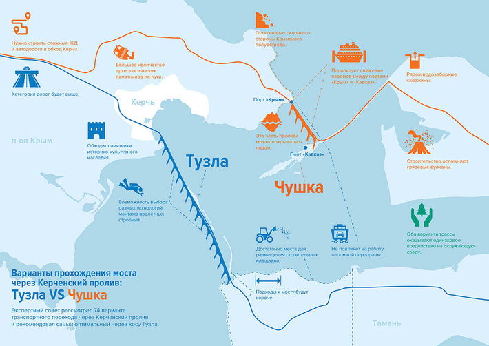 Известный советский и российский гидростроитель, бывший директор ЛенГЭС Юрий Севенард утверждает, что в проливе высокая сейсмика и мост просто может не выдержать землятресения.Землетрясение до 8,6 баллов может произойти в Керченском проливе раз в 500 лет. До 9 баллов — раз в 1000 лет. До 9,3 баллов — раз в 2000 лет. Но Крымский мост не первый и далеко не последний мост в мире, который строится в условиях высокой сейсмичности. Что произойдет, если 9-балльное землетрясение все же случится? Во время мощных подземных толчков основную волну примут на себя опоры моста, а колебания, идущие от опор к пролетам моста, будут гаситься с помощью антисеймических устройств — они являются «прослойкой» между опорой и пролетом. Конечно, наверняка, потрескается дорожное полотно. Вероятно, будут деформированы рельсы. Но основной конструктив моста устоит. Он по проекту рассчитан на то, чтобы устоять даже в такое землетрясение. После 9-балльного землетрясения потребуются ремонтные восстановительные работы. Но мост не будет разрушен.Ещё говорят, что слабые грунты не позволят построить мост должным образом…Именно поэтому — из-за большой толщи илистых слабых грунтов — сваи Крымского моста уходят на значительную глубину — от 18 до более чем 70 метров. Под каждую опору — а их всего 595 — бурились геологические скважины, чтобы в каждом конкретном случае уточнить, где начинаются твердые грунты, которые послужат надежным основанием для опор. Ну и еще одна особенность — сваи погружаются не только вертикально, но и с наклоном, что придает опорам дополнительную устойчивость.В 1944 году уже был построен железнодорожный мост через Керченский пролив. И как мы знаем, спустя 4 месяца после открытия его разбили льды с Азовского моря. Не ждет ли новый мост такая же судьба?А как строят мосты за Полярным кругом? Опоры моста через Керченский пролив рассчитаны на ледовые нагрузки, возможные в проливе; да и между ними достаточно большие пролеты, так что никакой дополнительной помощи в борьбе со льдами мосту не потребуется. Тем не менее, для контроля ледовой обстановки во время эксплуатации моста будет идти мониторинг. И при необходимости суда ледокольного типа, расположенные в порту Новороссийска, в течении 8-10 часов готовы прибыть для дробления ледовых полей.Почему выбрано именно это место для строительства моста? Есть более короткие участки.Экспертный совет рассмотрел 74 варианта транспортного перехода через пролив и рекомендовал самый оптимальный через косу Тулза. Подробнее — на инфографике.