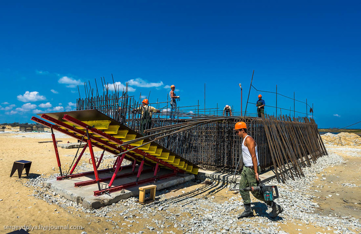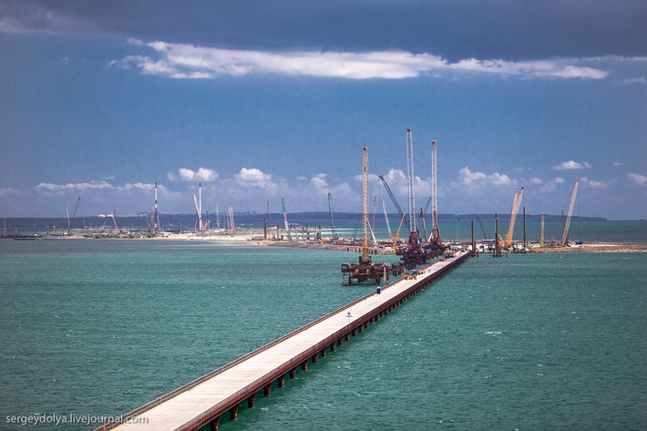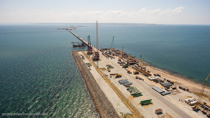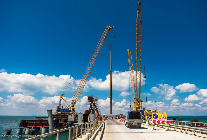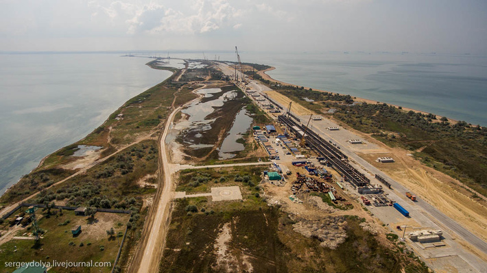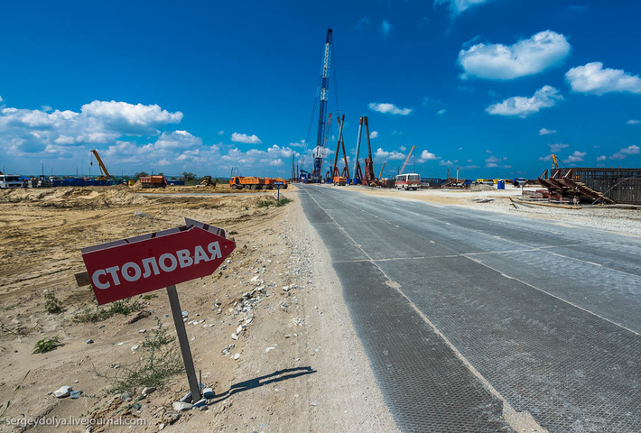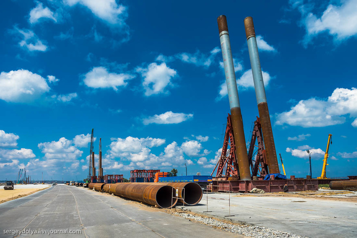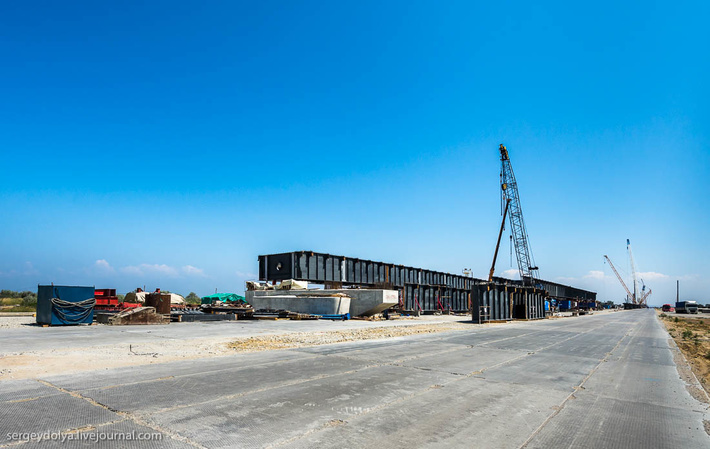 Подведу итог: я проехал вдоль практически всего строящегося моста со стороны Краснодарского края. Стройка похожа на муравьиную тропу, где вместо муравьев грузы таскают грузовики. Все кишит, движется, поднимается в воздух и опускается в землю. Стоя на стройке возникает ощущение, что несмотря на заявления скептиков, мост все-таки построят: