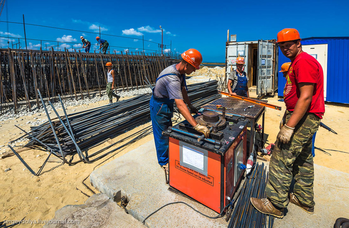 Сегодня основная проблема, с которой сталкиваются строители — погода. По статистике 10 дней в месяц штормит и в это время невозможно ничего делать с воды. Чтобы решить эту проблему, построили два рабочих моста (со стороны Тамани и Керчи). По ним ездит техника и забивает сваи: