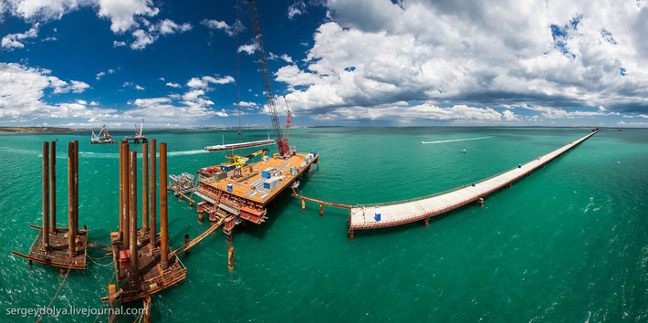 Начнем с приятного. Если абстрагироваться от политики и говорить лишь о технической части — мост грандиозный. 19 километров — это самый большой мост в России, настоящая стройка века. Но что он собой представляет?Во-первых, моста два — автомобильный и железнодорожный. Связаны они только там, где будут судоходные пролеты, в остальном совершенно независимы друг от друга. В приоритете сейчас автомобильный мост, его должны сдать в конце 18 года. Затем через год железнодорожный.Первый этап строительства — это сваи, которые уходят под разными углами в землю на глубину до 90 метров. Такая глубина обусловлена так называемыми «слабыми грунтами», которые не могут должным образом держать опору моста. Второй этап — монтаж пролетных сооружений. Самые важные элементы здесь — опоры судоходного пролета. Мы видим, что у обоих мостов эти опоры соединены и огорожены железобетонными «островами», которые защитят от случайного или специального столкновения с судами.Третий и четвертые этапы, по сути, косметические, про них говорить пока особенно нечего: