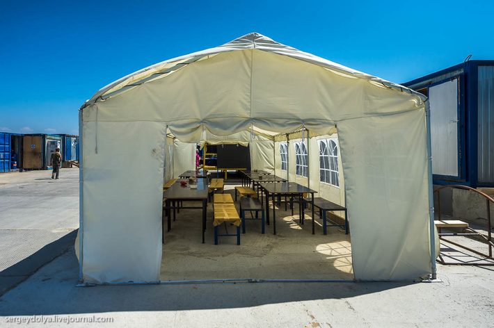 Мне было интересно посмотреть не только на строительство моста, но и на быт рабочих. Трудятся тут вахтовым методом: 15 дней работают, 15 дней отдыхают. Средняя зарплата — 35 тысяч рублей, при этом строители бесплатно живут, питаются и раз в месяц им оплачивают проезд до дома и обратно. Утром и вечером кормят в строительном городке, а обед привозят прямо на мост:
