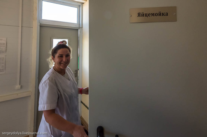 Кроме горячего и холодного цехов есть отдельное помещение под названием «Яйцемойка». В принципе, если задуматься, неудивительно: 2000 рабочих потребляют как минимум 4000 яиц на завтрак: