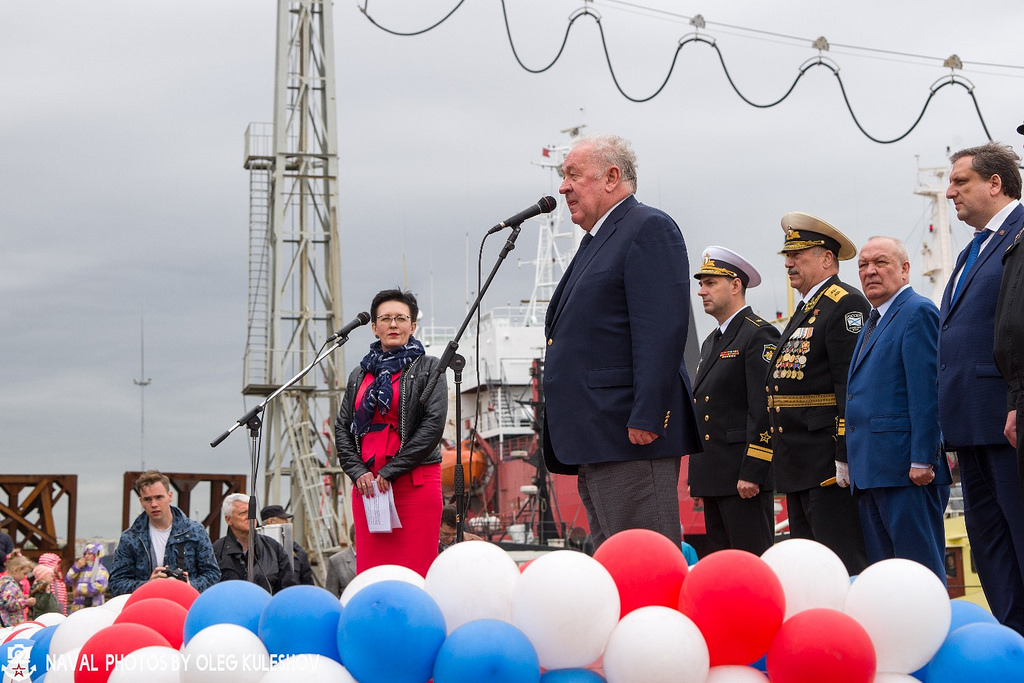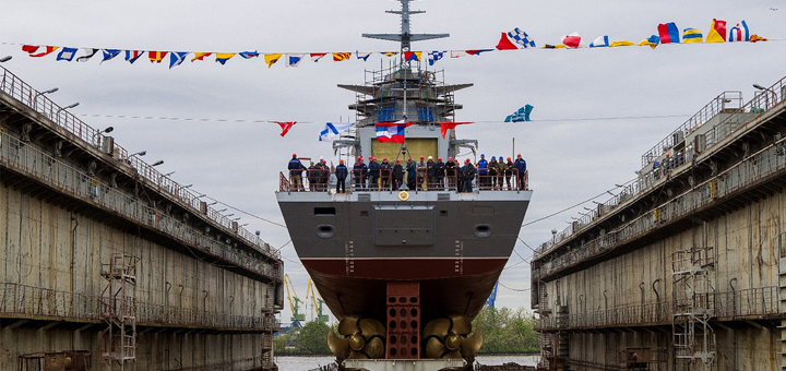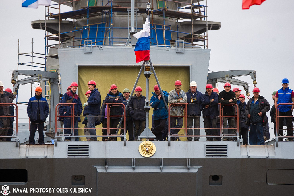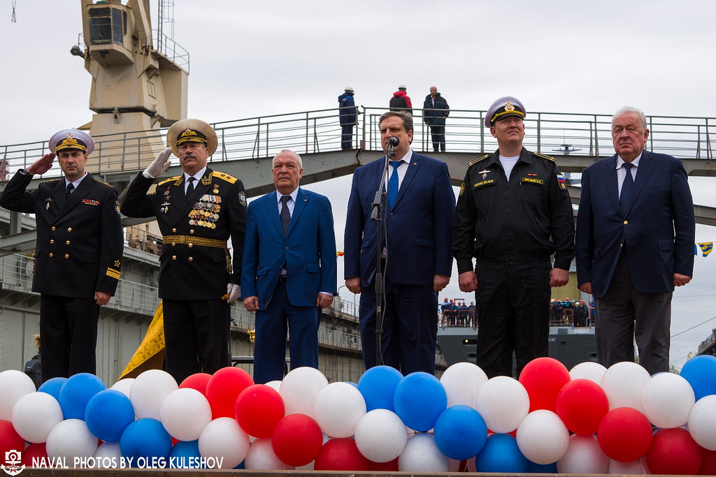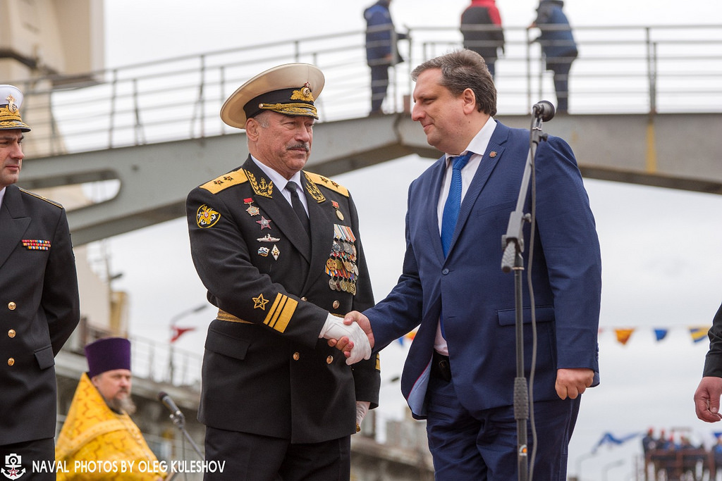 Команду на спуск погружного дока с кораблем дал вице-президент Объединенной судостроительной корпорации (ОСК), генеральный директор «Северной верфи» Игорь Пономарев.