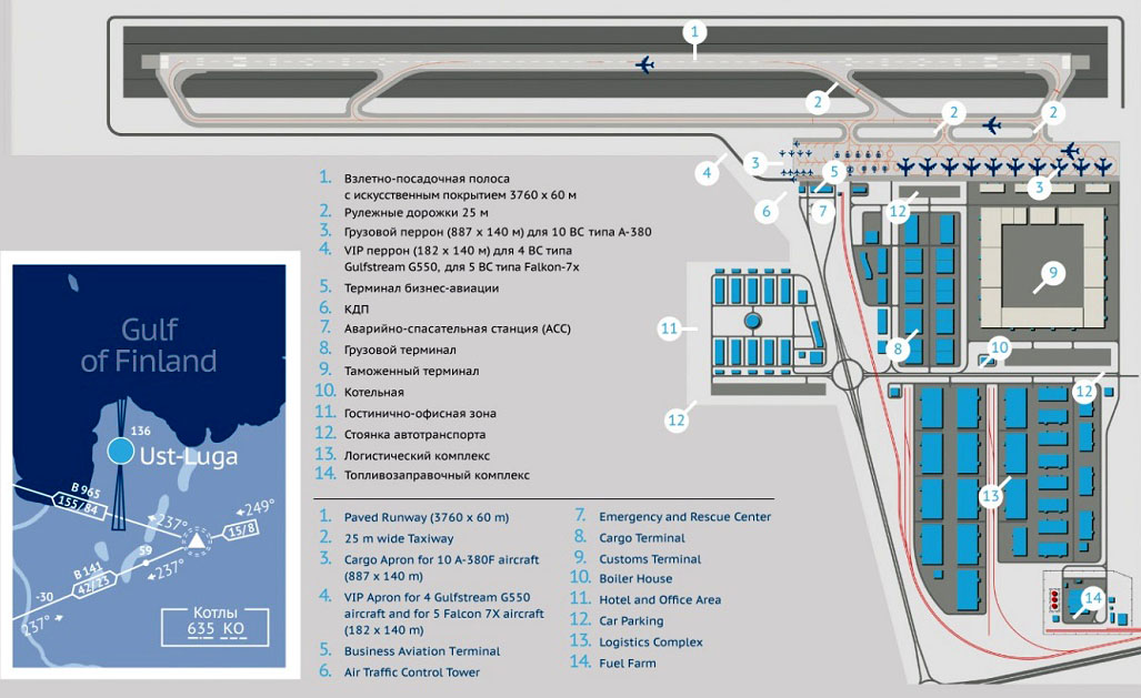 6. Схема грузового аэропрота Усть-Луга, завязанного в общий логистический узел с портом. ВПП очень солидная — 3760 м x 60 м. (планируется к 2019)