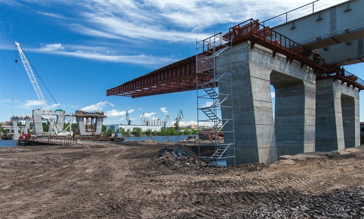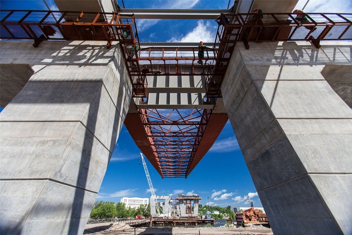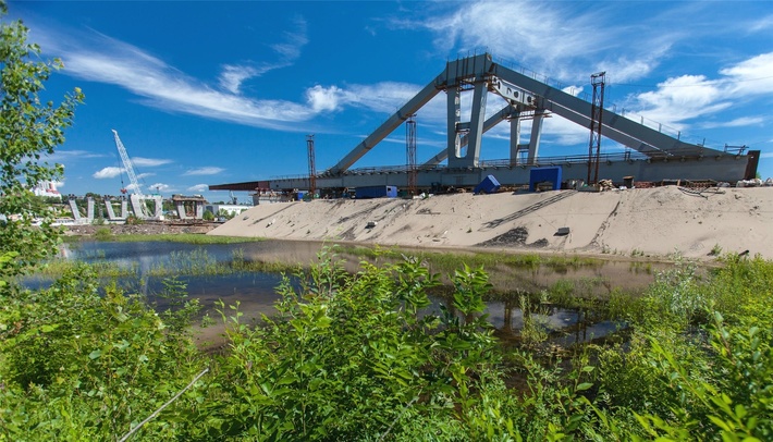 В Самаре продолжается строительство Фрунзенского моста через реку Самара. В настоящий момент строители ведут сборку и надвижку металлического пролётного строения моста, а также строительство двух оставшихся русловых опор (остальные опоры уже полностью готовы).