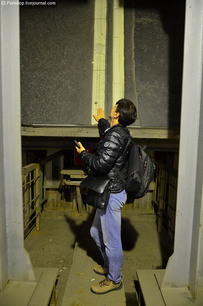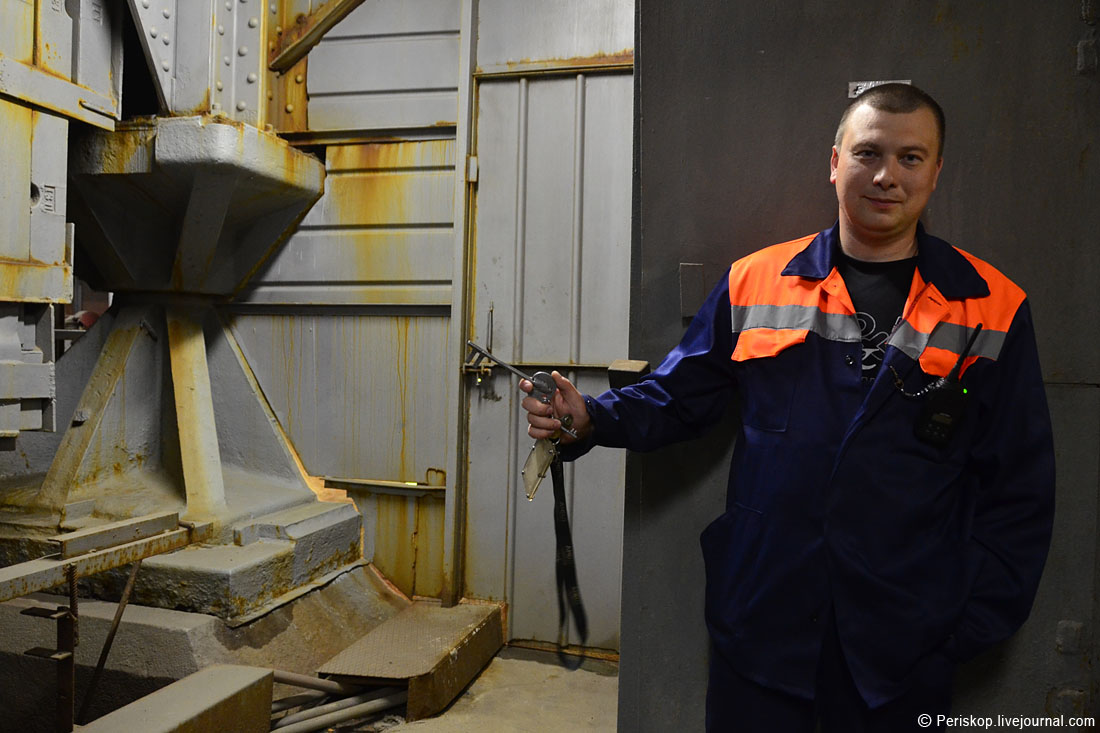 12. Возвращаюсь назад, и помощник начальника смены открывает дверь вбок, вот этим архаичным ключом, который здесь с 1971 года, с момента реконструкции механизма.
