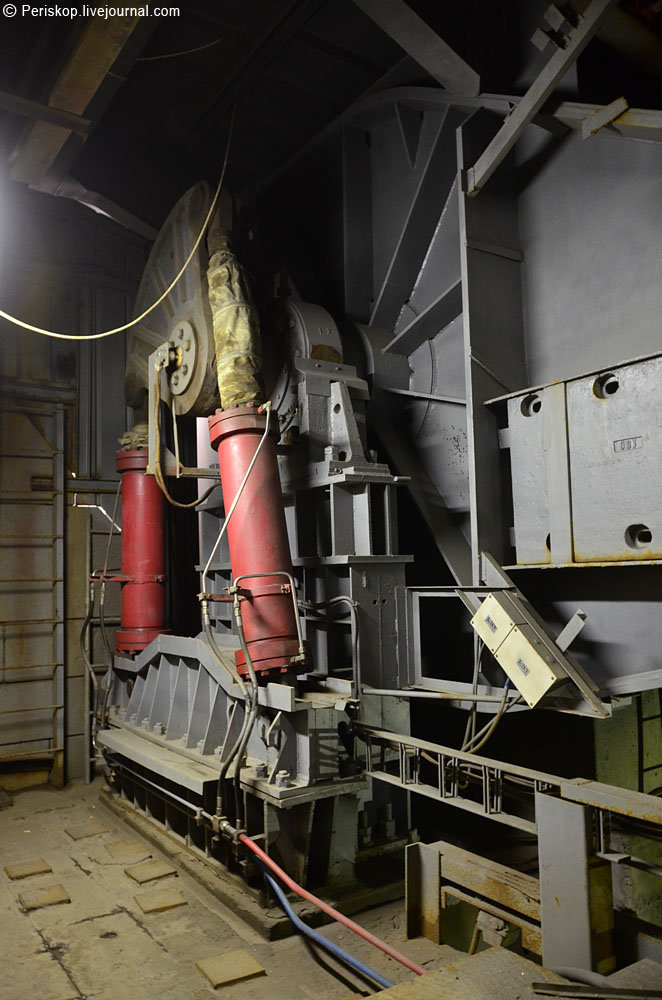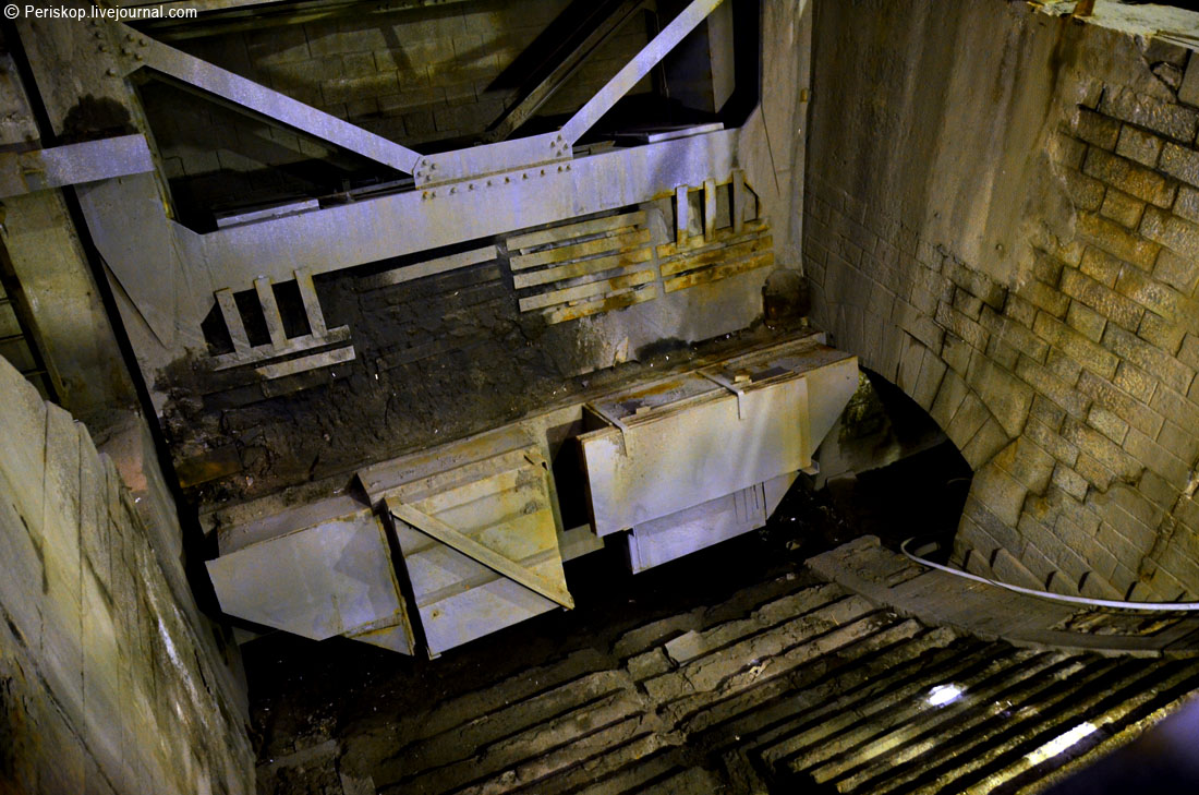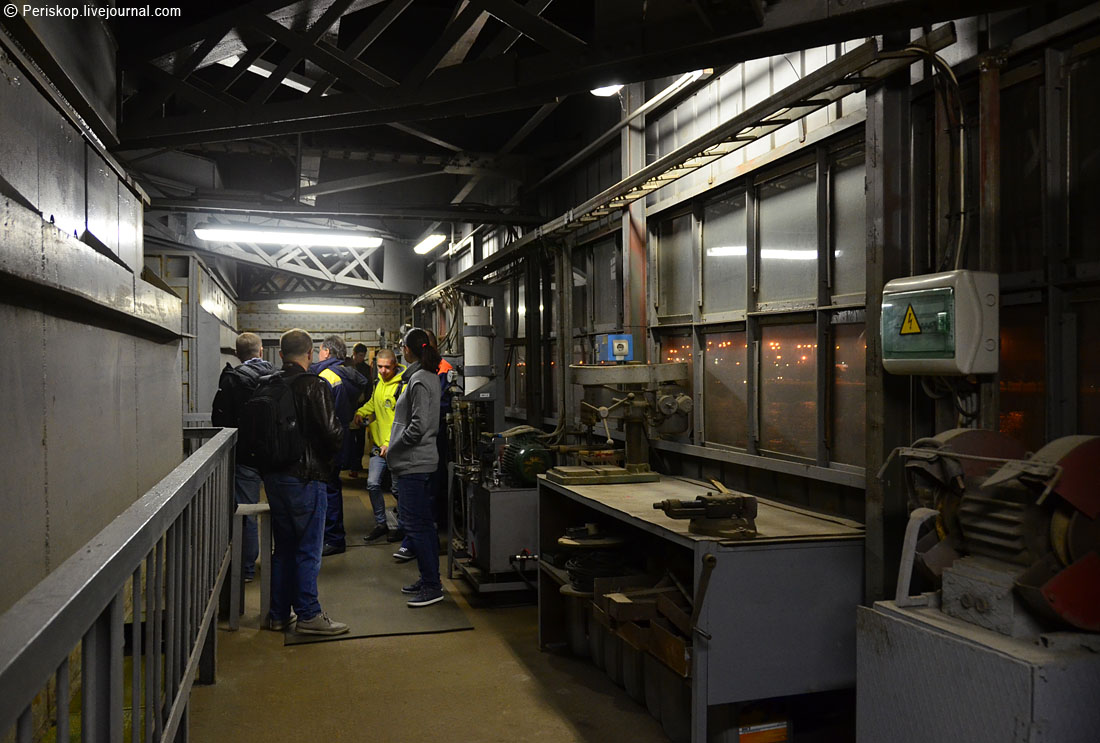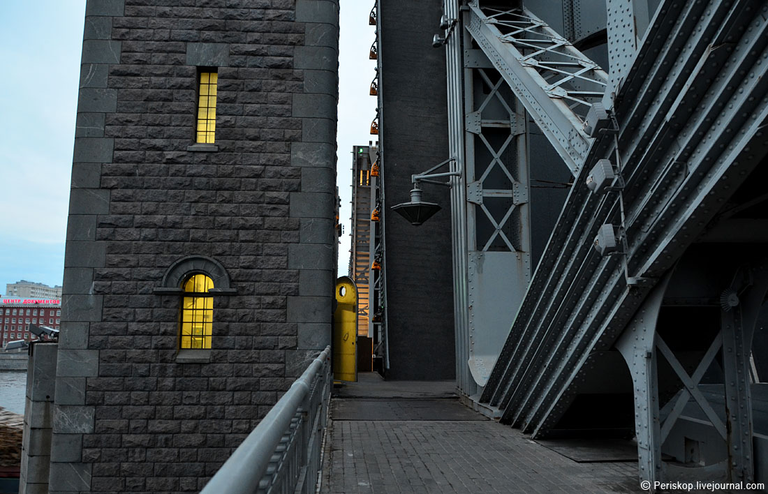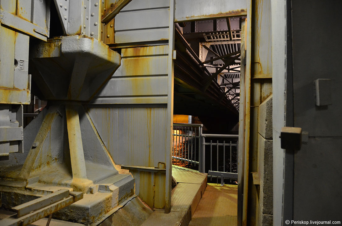 16. Захожу под мост. Здесь обустроено помещение мастерской и расположена центральная группа цилиндров. Массивная металлическая стена слева — это конструкции противовесов, который после разводки уйдут вниз. Но пока мост сведён.