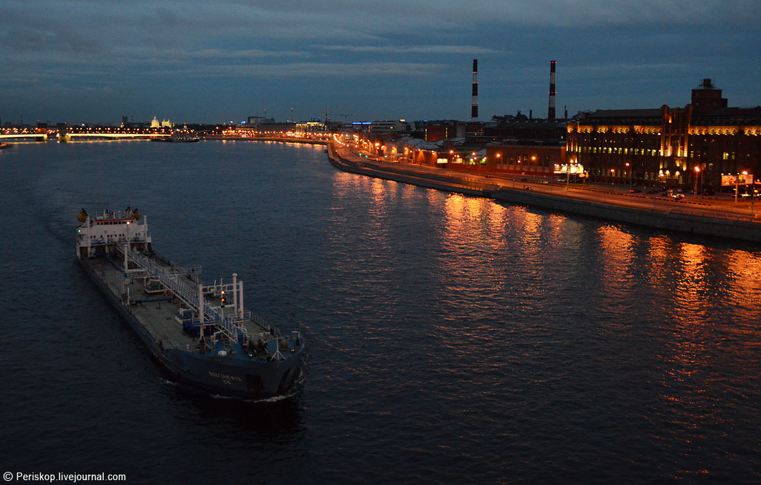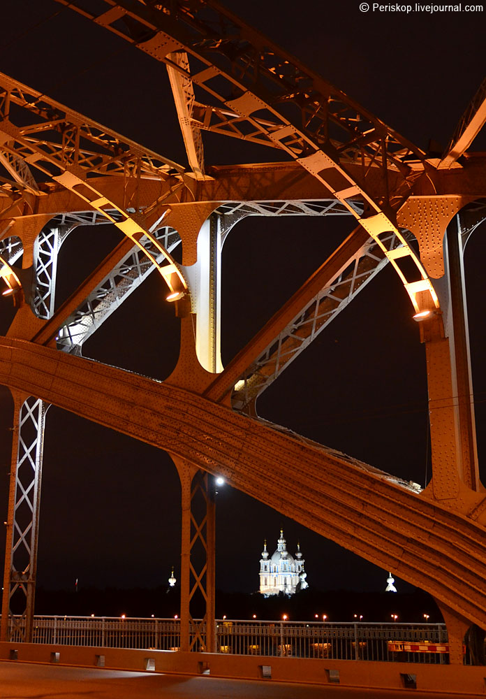 3. К северу на левом берегу хорошо виден ярко подсвеченный Смольный собор. Белые ночи уже сходят на нет, так что контраст собора и его тёмных окрестностей очень велик.