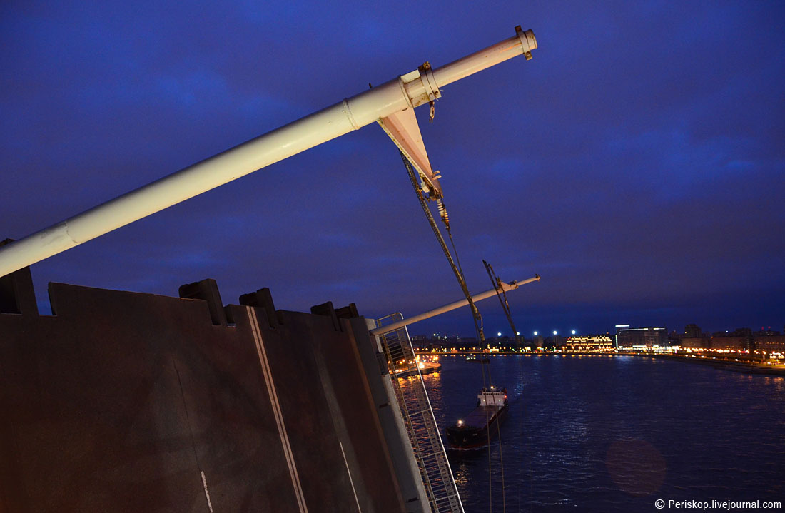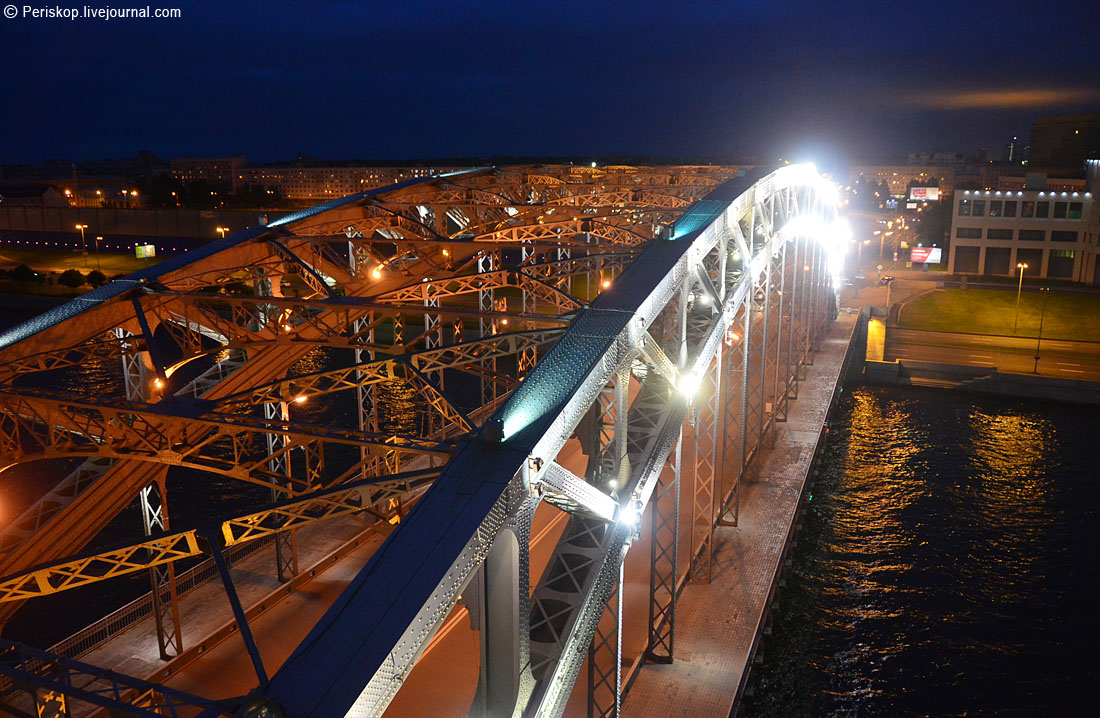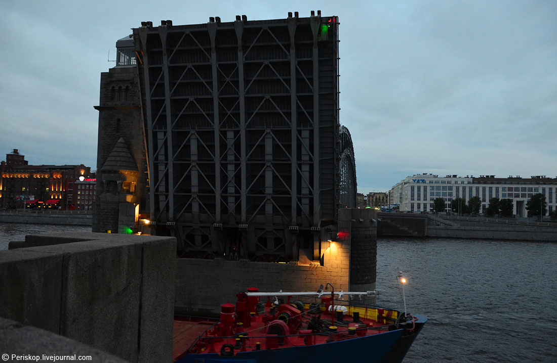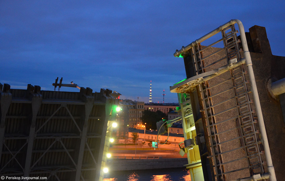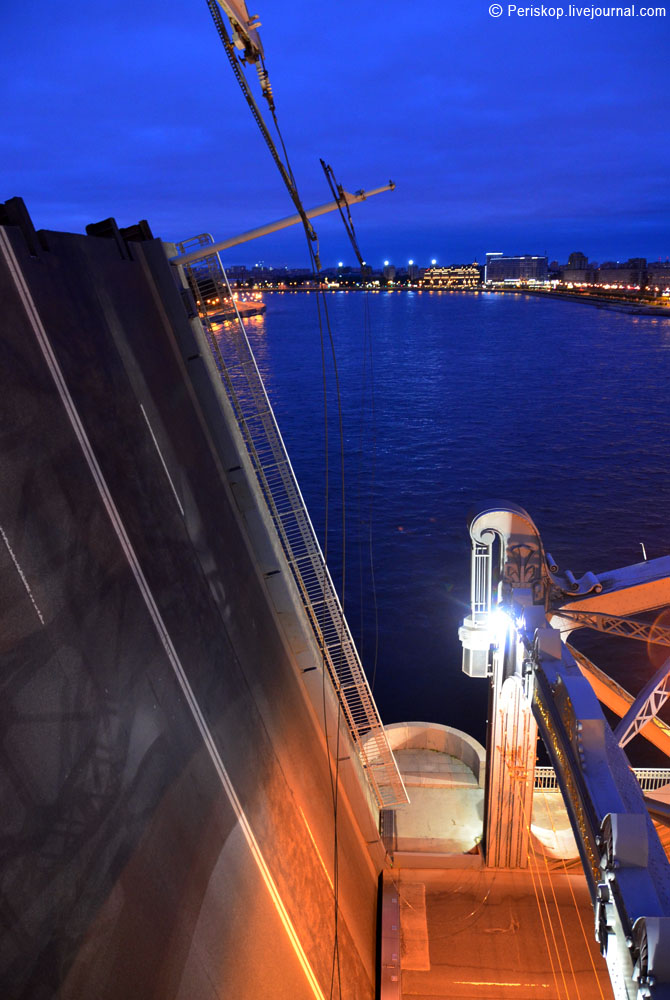 Когда-то, в далёком 1988 году во время моего второго визита в Ленинград, я совершенно случайно увидел этот харизматический мост в ходе поездок по городу и страшно поразился тому, что он не был нигде описан в тогдашних стандартных путеводителях. Нет, про него (наверное) писали в более подробных фолиантах, но в обычном атласе «СПб для туриста» не было ни одной картинки! А ведь он, возможно, самый красивый из всех… С тех пор во мне поселилось желание хоть когда-нибудь подняться на эти «рыцарские» башенки и увидеть своими глазами виды оттуда. И вот, в ночь с 8 на 9 июля моя мечта осуществилась: я оказался в самом чреве этого моста и принял участие в его разводке. Было вопросом принципа туда попасть, в рамках проекта spbblog и «Мостотреста» СПб — и это, к счастию, удалось.