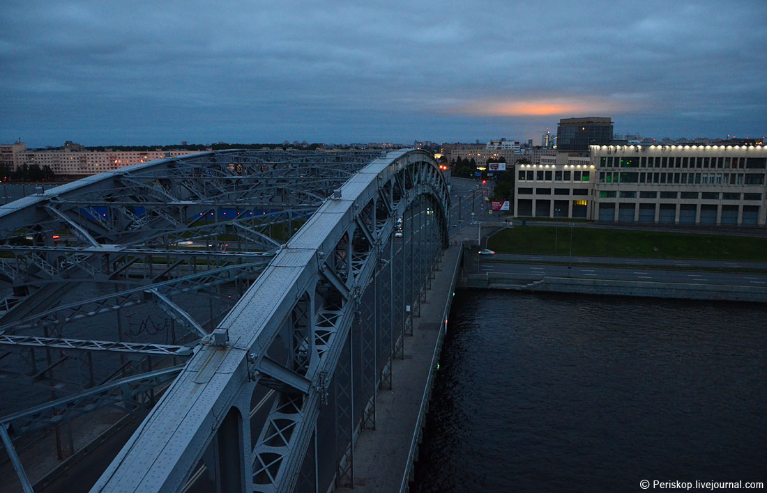 35. Теперь четвертая сторона — вид в сторону Охты. К сожалению, огни подсветки пролёта сильно засвечивают кадр, а в реале была очень хорошо видна разгорающаяся на востоке заря нового дня.