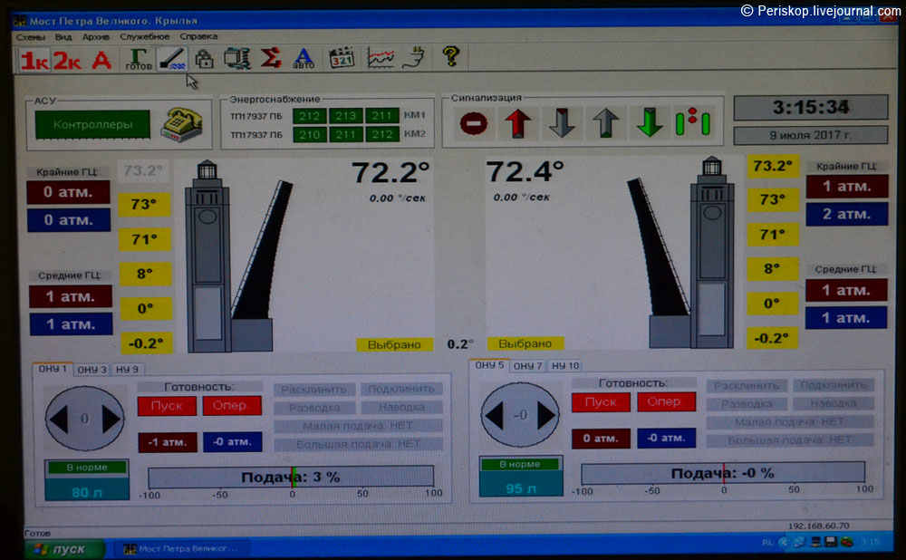 18. Ладно, до сакрального момента остаётся 5 минут, поднимаемся в пункт управления мостом. Юрий Владимирович Елистратов, начальник смены Большеохтинского моста, рассказывает нам о процессе управления и о его нюансах. В принципе, всё похоже на Троицкий, с тем изменением, что тут два крыла и все механизмы в башнях, отчего второй мастер должен быть на другом берегу во второй башне, контролировать механизмы там.