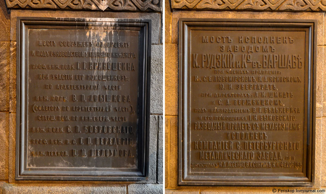 5. По обеим сторонам от дверей — 4 разных металлических таблички, которые были восстановлены в ходе реконструкции моста начала 1990-х. Вот две из них, которые у левобережной башни. Во-первых, тут интересно то, что основные пролёты делали в Царстве Польском, в Варшаве. А во-вторых, я неожиданно приметил хорошо знакомую для меня фамилию: Григорий Передерий. Да, тот самый Передерий, который строил левобережную эстакаду Амурского моста на Транссибе (см. фото №34 в этом посте). Удивительная встреча! Значит, он и тут отметился.