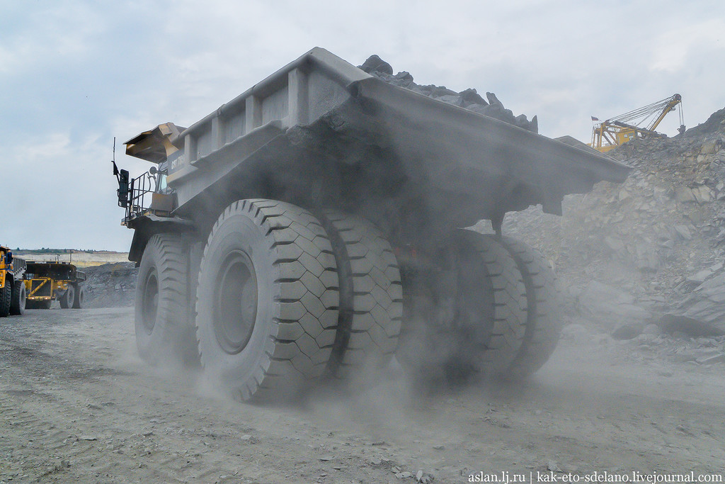 В карьере работает много всевозможной техники, но самая заметная, конечно же, — это многотонные самосвалы «Белаз» и «Caterpillar».