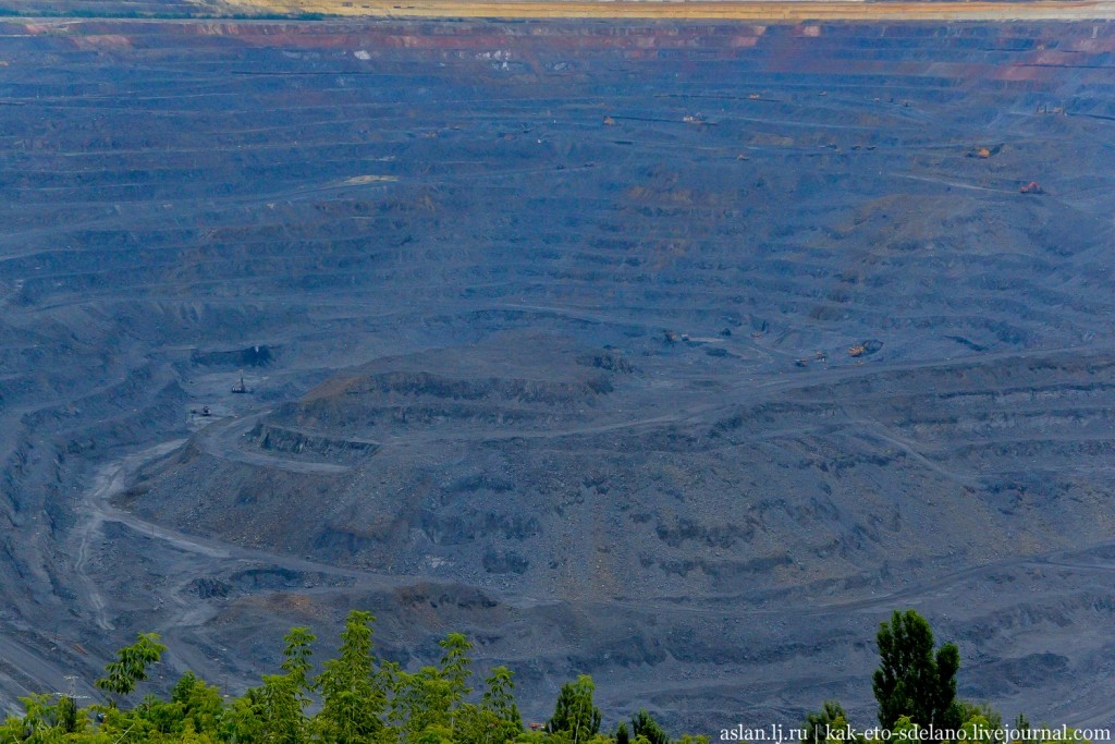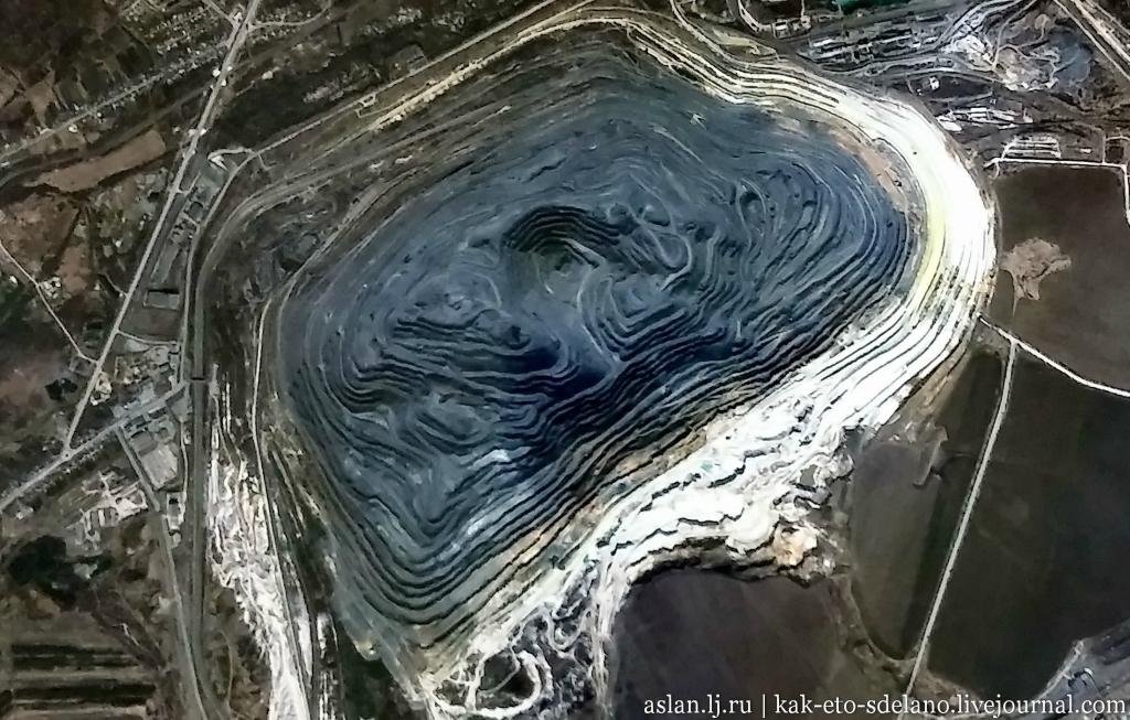 Он действительно огромный и разрастается с каждым днем. Глубина карьера Лебединского ГОКа — 250 м от уровня моря или 450 м – от поверхности земли (а диаметр – 4 на 5 километров), в него постоянно просачиваются подземные воды, и если бы не работа насосов, то он заполнился до самого верха за месяц. Он дважды занесен в книгу рекордов Гиннесса как крупнейший карьер по добыче негорючих полезных ископаемых.