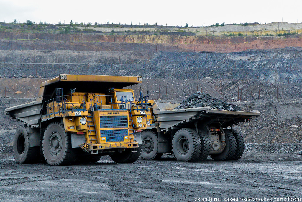 Этот Белаз за один раз перевозит до 220 тонн железной руды.
