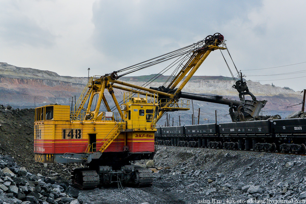 Железную руду загружают тут же в жд составы, в специальные усиленные вагоны, которые вывозят руду из карьера, они называются думпкары, их грузоподъемность – 120 тонн.