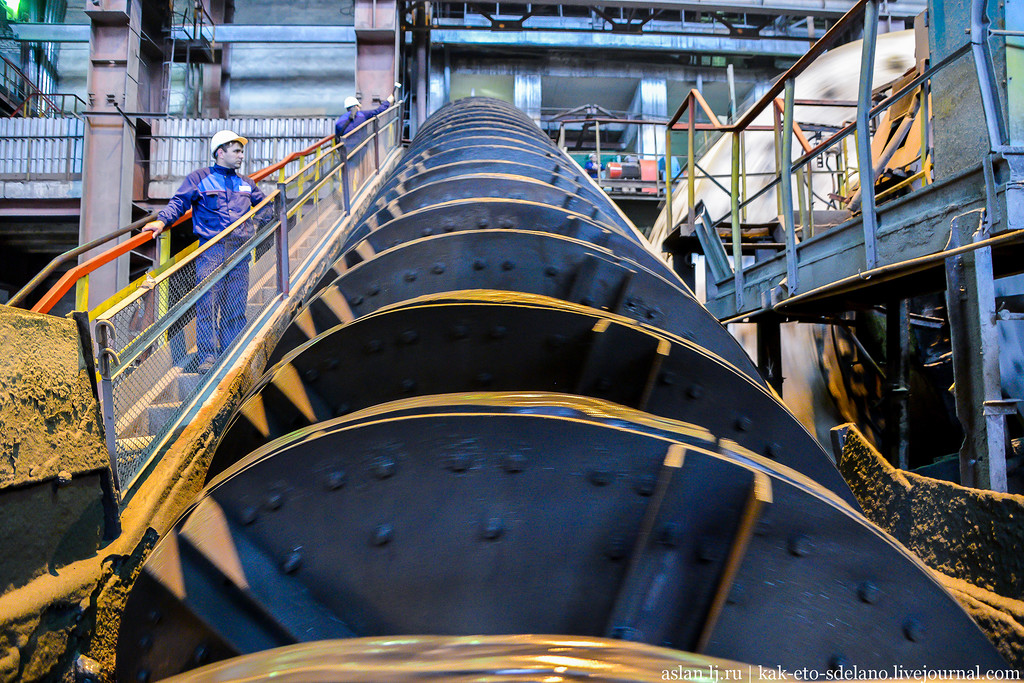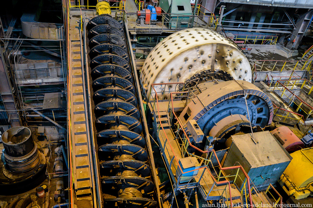 Масштабы цеха, где в барабанах дробится руда впечатляют. Руда перемалывается естественным образом, когда камни бьются друг о друга в процессе вращения. В барабан с семиметровым диаметром помещается около 150 тонн руды. Существуют и 9-метровые барабаны, их производительность больше чуть ли не вдвое!