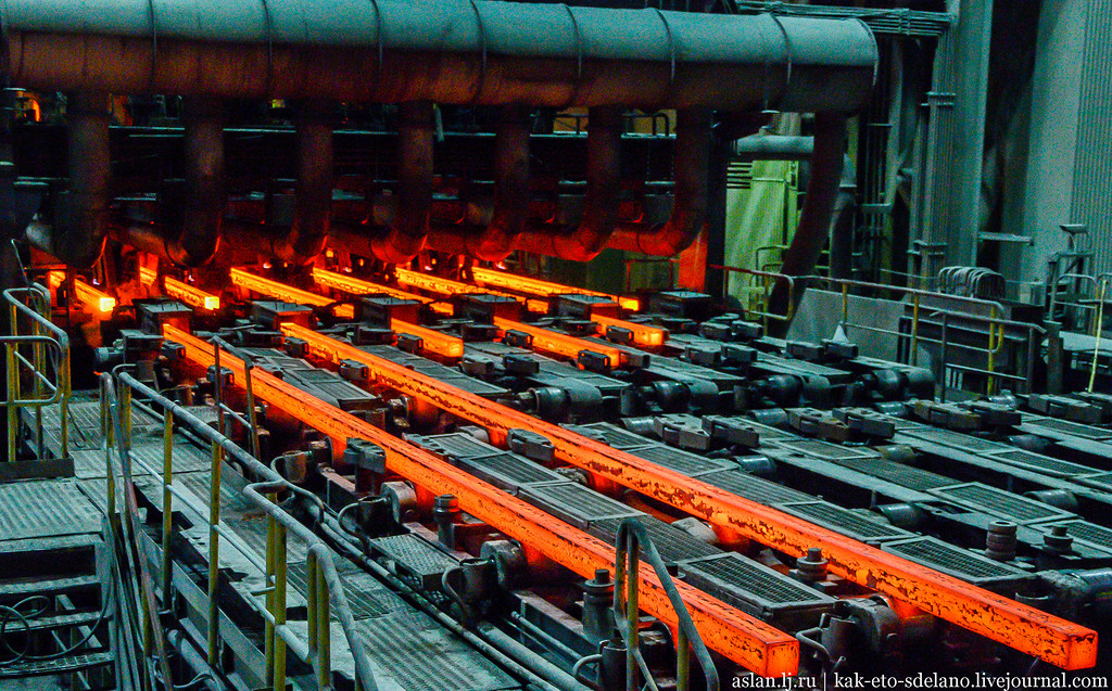 В одном из цехов комбината производят вот такие стальные заготовки. Их длина может достигать от 4 до 12 метров, в зависимости от желания заказчиков. На фото 6-ручьевая машина непрерывного литья заготовок.