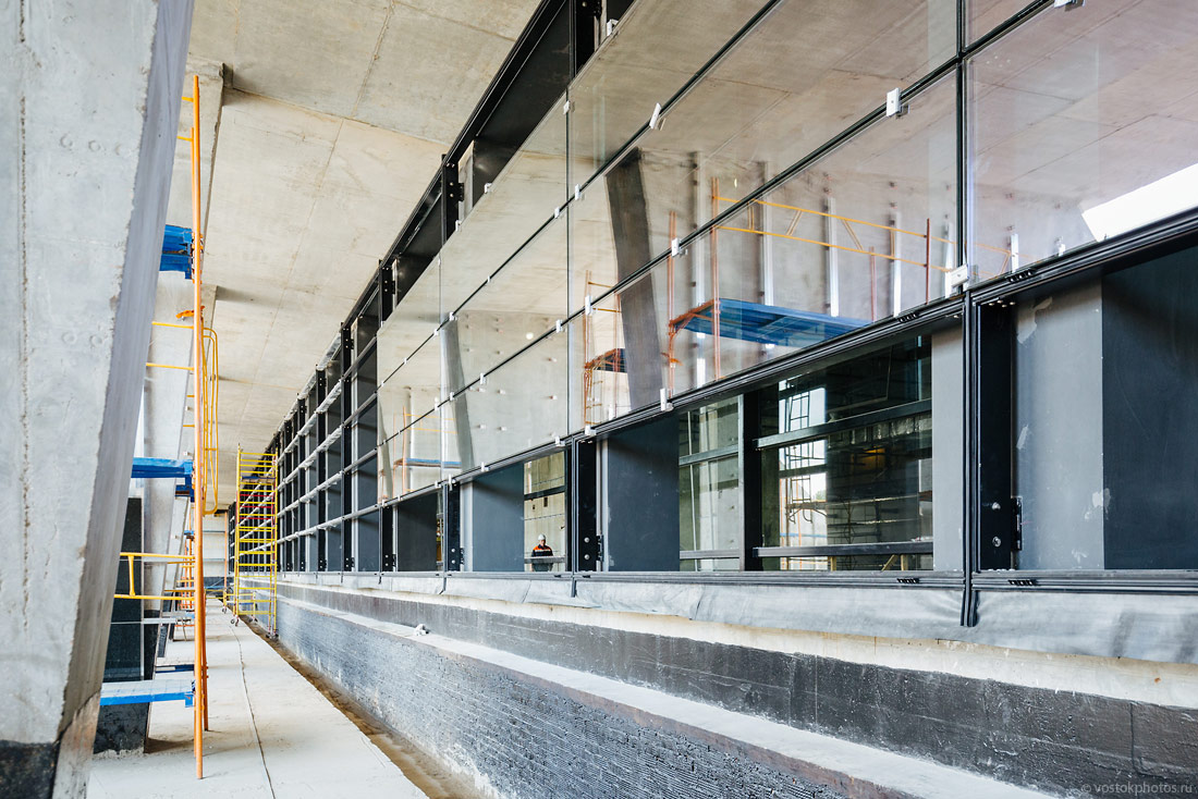 6. Яркие бело-красные ограждения — это будущий панорамный балкон, который планируется связать пешеходными дорожками с парком в долине реки Очаковки. На нижнем уровне видны зеркальные витражные проёмы на всю высоту стен. Они проходят вдоль части западной путевой стены станции.