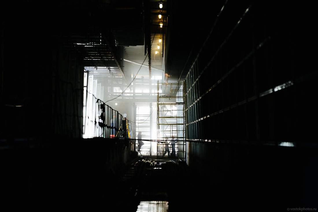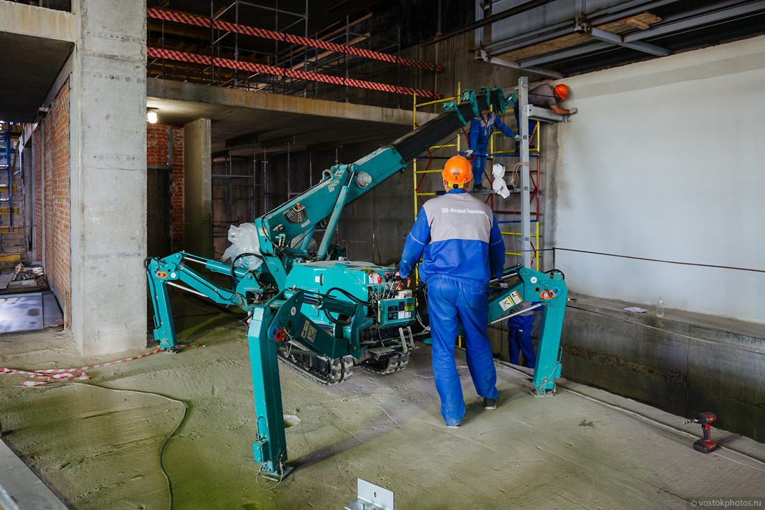7. Вот так выглядят эти витражи вблизи. Я стою на улице, а гражданин в каске идет по платформе будущей станции.
