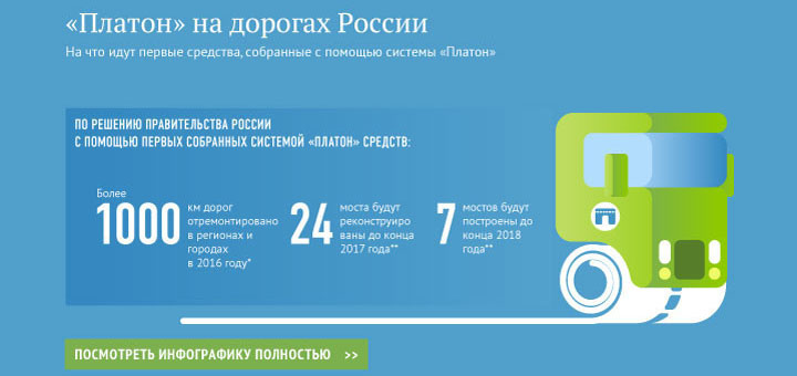 За счет собранных системой средств в прошлом году в 40 городах и регионах отремонтировано свыше 1 тысячи километров дорог, профинансировано строительство 7 крупных мостов и ремонт 24 аварийных путепроводов, многие из которых не один год были закрыты для движения. Так, в начале августа этого года открылось движение на новом Борском мосту в Нижнем Новгороде, на строительство которого был выделен самый большой трансферт за счет средств от системы «Платон» — 3,6 миллиарда руб.