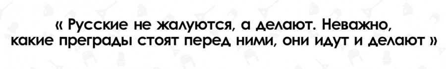 — Русские не жалуются, а делают. Неважно, какие преграды стоят перед ними, они идут и делают. Французов может смутить любая мелочь, они откажутся что-то делать и будут жаловаться. В России, наоборот, скажут: нас проблемы не волнуют, это классная идея, давай сделаем.