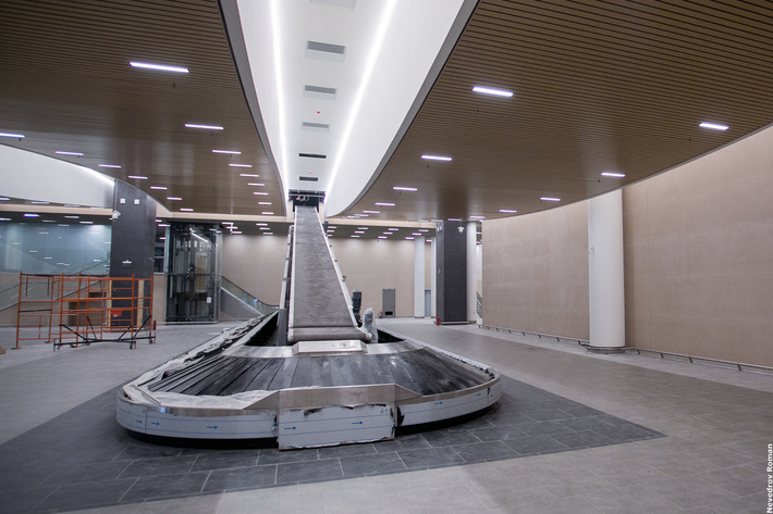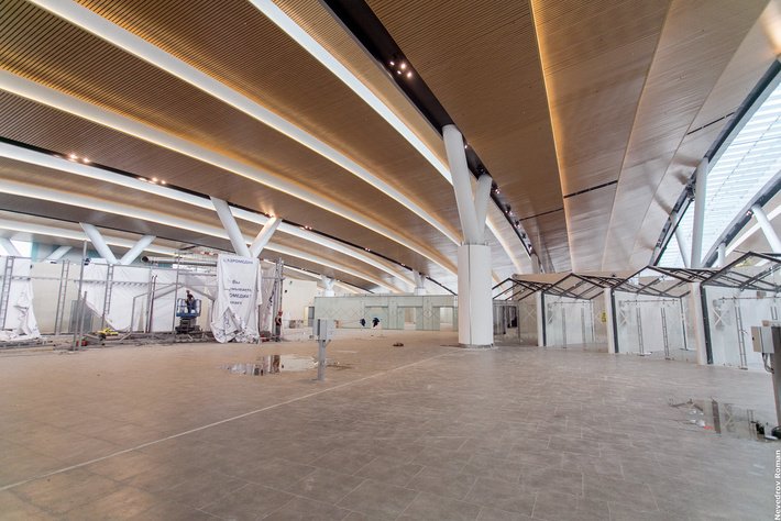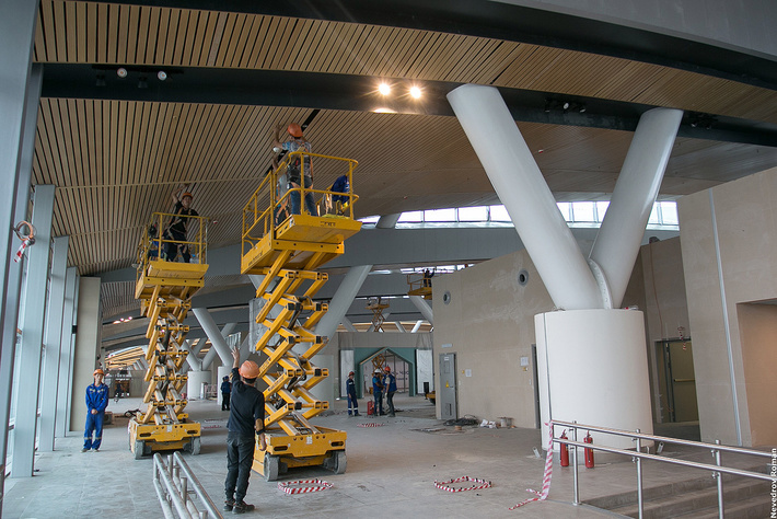 В здании аэровокзала ведутся активные отделочные работы. Завершается монтаж потолков, ведется установка павильонов для магазинов и общепита.