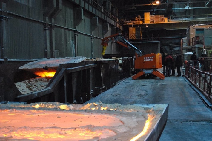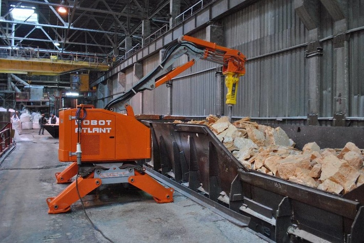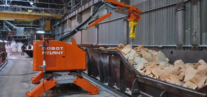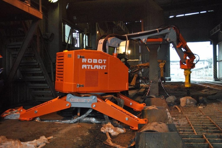 Металлургическая промышленность Работы по замене огнеупоров и ломка футеровки доменных и электродуговых печей. Работы связанные с ремонтом плавильной печи и работы по удалению шлака. Благодаря дистанционному управлению рабочим не нужно находиться в высокотемпературной зоне, зоне шума и выбросов, а всеми процессами можно управлять находясь на безопасном расстоянии от объекта работ.