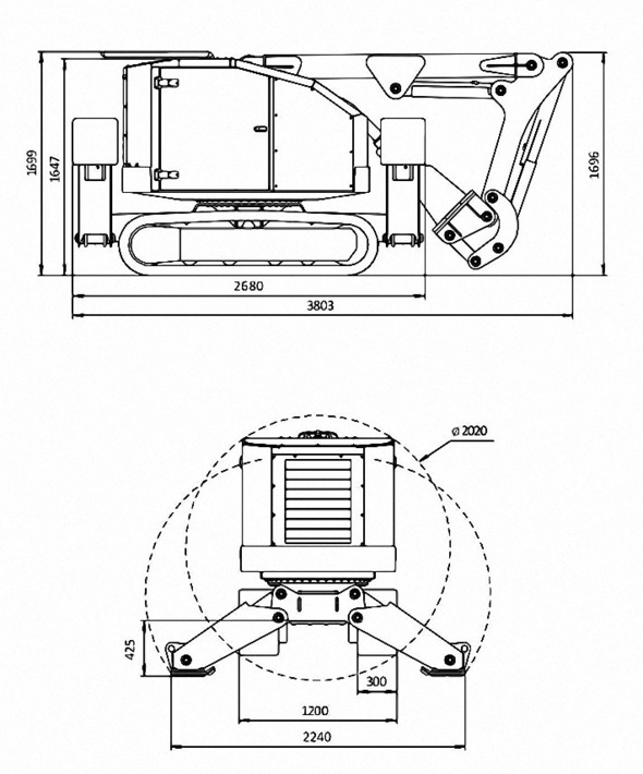 Конструкция трехсекционной стрелы позволяют оператору устанавливать гидромолот под прямым углом к любой поверхности. Такой угол обеспечивает максимальную эффективность работы гидромолота и максимальную прижимную силу. Также конструкция стрелы обеспечивает возможность работы с максимальным раскрытием секций. По горизонтали максимальная дистанция работы — 6,0 метров, вверх — 6,5 метров, вниз 4,0 метра. Робот со стрелой поворачивается на 360 градусов вокруг своей оси.