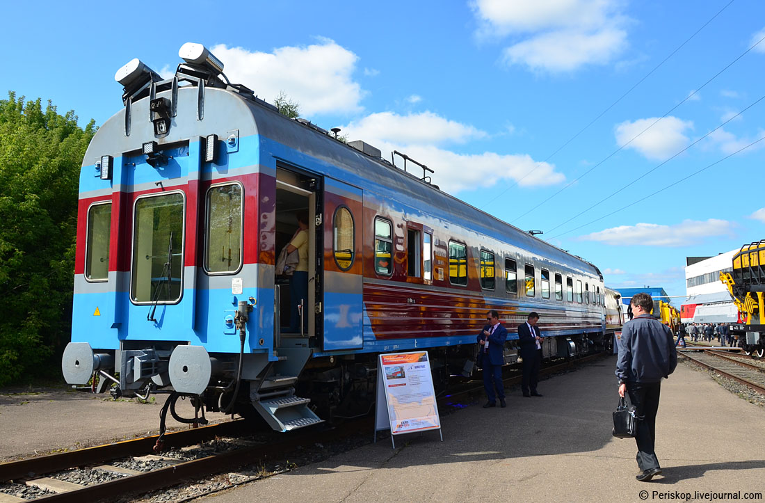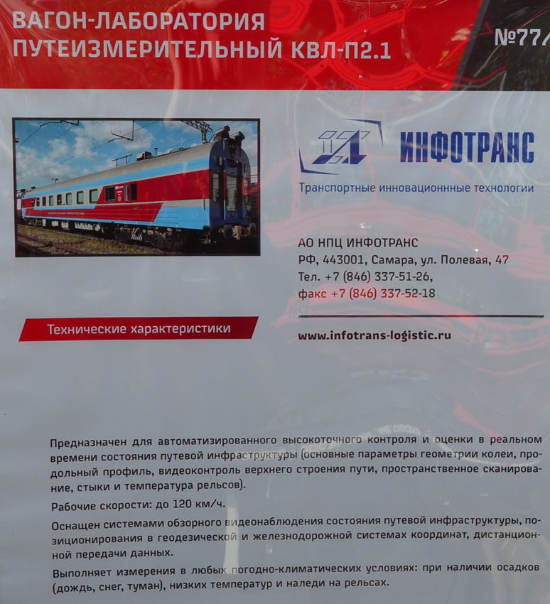 14. Вот любопытный экспонат — новый путеизмерительный вагон КВЛ-П2.1, незаметная пассажиру рабочая лошадка для поддержания на должном уровне технического состояния магистралей. Диагностирует состояние пути по более чем десятку параметров, выдаёт путейцам задания и выставляет ограничения движения, если обнаружены проблемы. Зайдём?