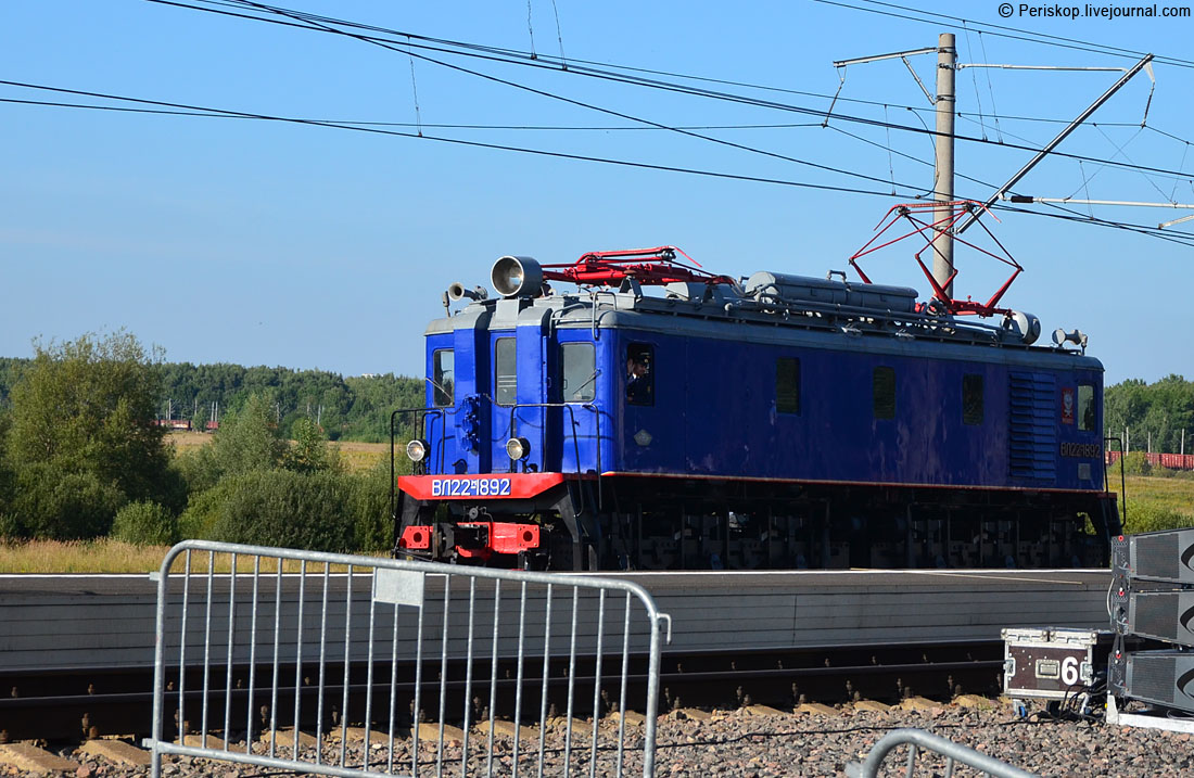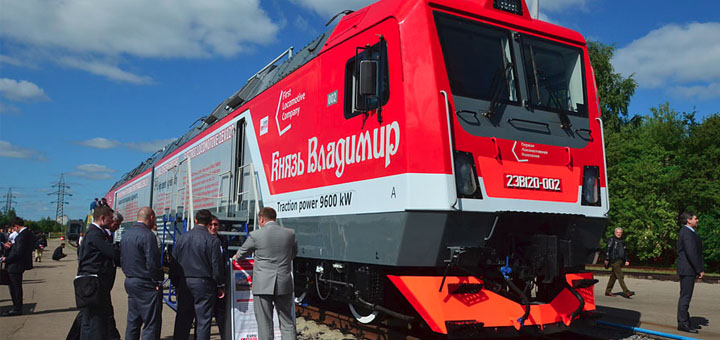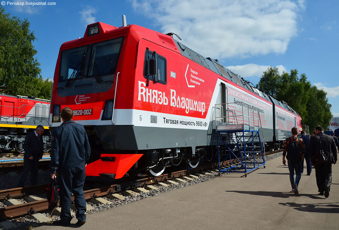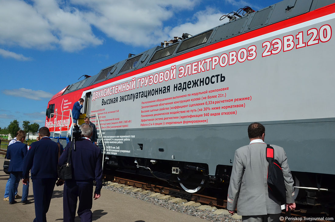32. Так вот. Мне исключительно повезло вписаться в одну из таких групп, когда они смотрели новый электровоз «Князь Владимир» 2ЭВ120. Это конкурент Сименса и Уральских локомотивов, основан на платформе TRAXX от Бомбардье. Он как раз на испытаниях во ВНИИЖТ — правда не знаю, сертифицирован уже для магистрального движения или ещё нет.