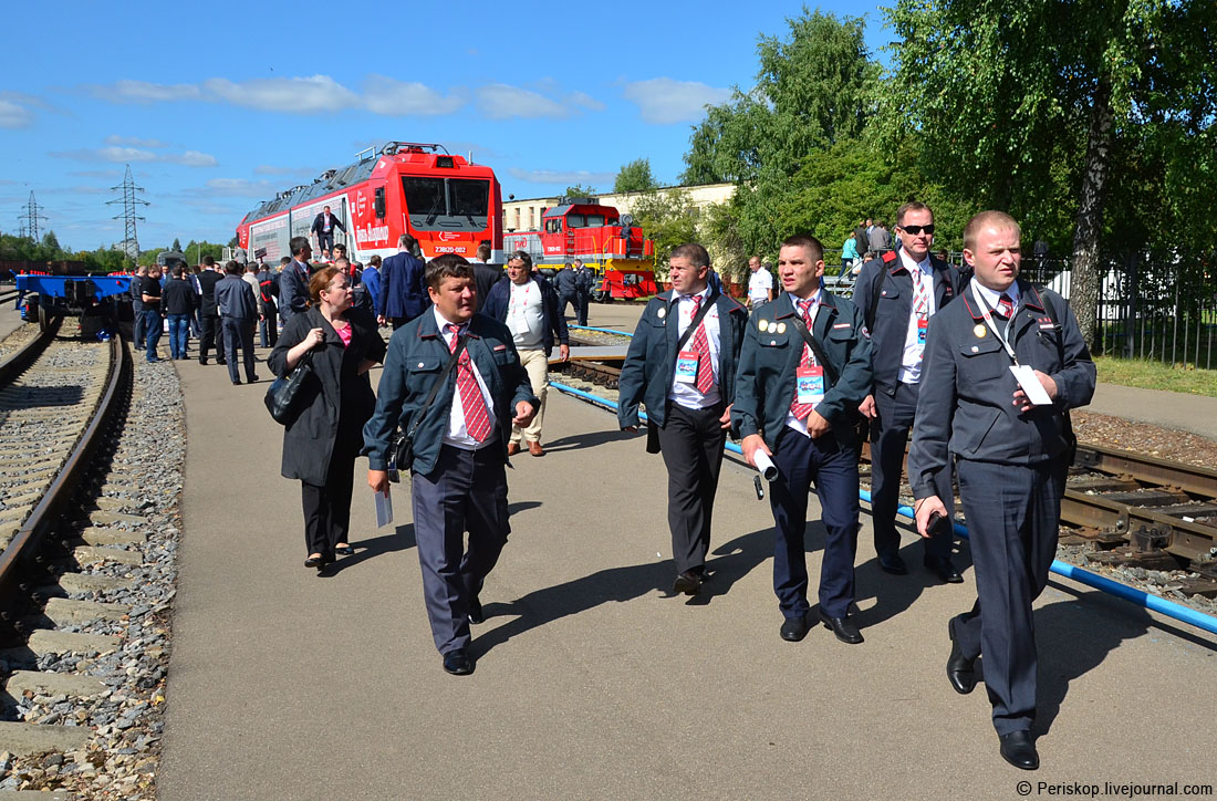 31. Самое интересное во втором дне неожиданно для меня оказалось то, что он совпал с осмотром техники линейными машинистами: к проведению ж/д салона приурочили и всероссийский слет машинистов. И вот по всем путям ходили группы суровых мужчин в форме с рентгеновскими цепкими взглядами. Групп было много, наверное не менее десятка, они разделились для удобства осмотра всех магистральных локомотивов.