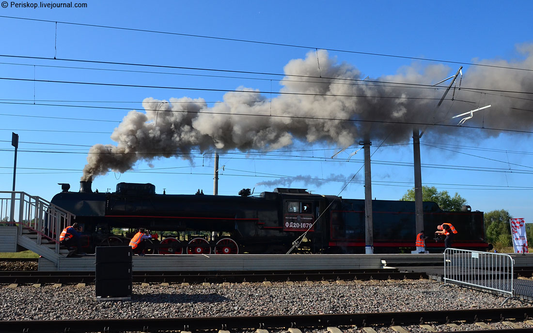 42. Динамическая экспозиция — красивая, особенно парад паровозов, но (увы) далековато от зрителей. Зачем-то пустили красавцев-паровозов по дальнему пути, а не по второму от зрителей. Но сама организация — на высоте. Хорошая музыка, нормальный и вменяемый дикторский текст практически без ляпов; в общем — респект организаторам. Прошло порядка 8 паровозов разных типов (от дореволюционных Ь и Ов до П-36 и ЛВ), затем антикварные электровозы и тепловозы, после чего — современные локомотивы, включая 4-секционного гиганта 4ЭС5К «Ермак».
