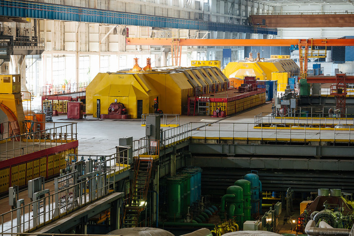 4. Огромный машинный зал на четыре энергоблока. Три старых и один новый, четвертый, который почти не видно. Это единственная в России газовая электростанция, все энергоблоки которой имеют мощность по 800 МВт.