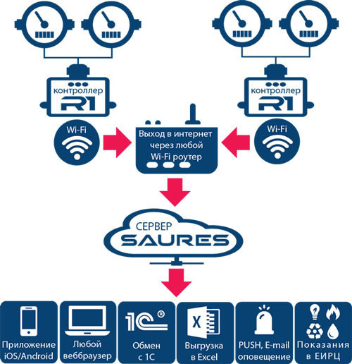 Учет расхода и дистанционное снятие показаний счетчиков воды — не единственный вариант применения контроллера. SAURES R1 работает со счетчиками газа, электричества и датчиками температуры, что делает прибор интересным не только жителям квартир, но и владельцам частных домов, коттеджей и дачных участков.