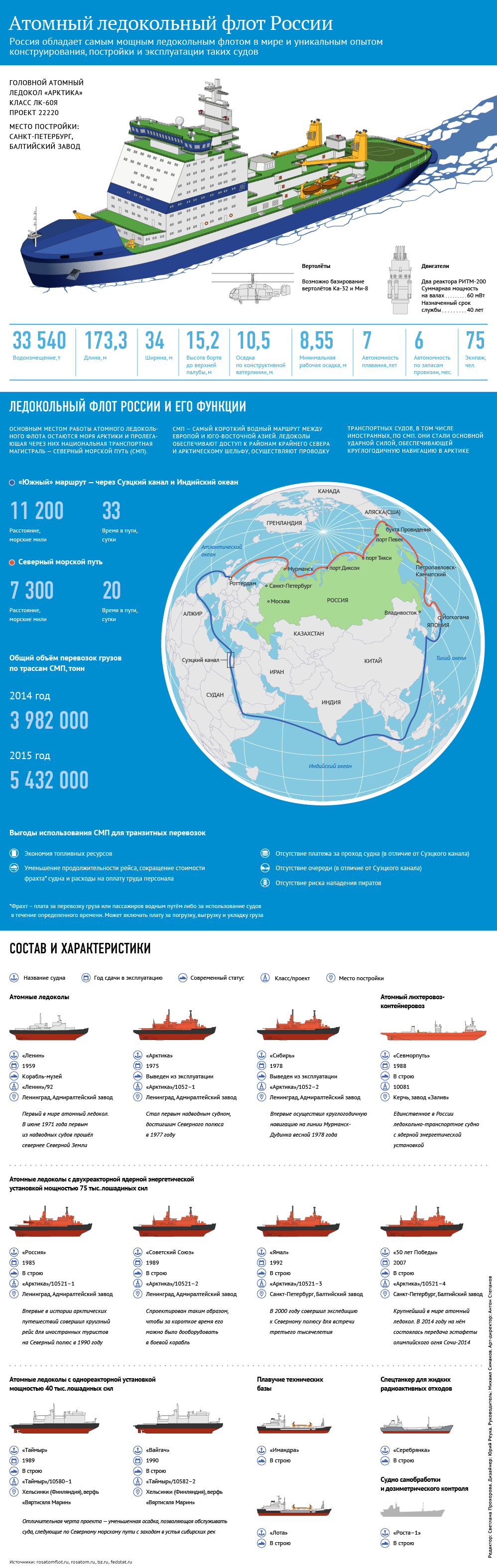 Универсальные атомные ледоколы проекта 22220 станут самыми большими и мощными в мире. Они нужны для обеспечения российского лидерства в Арктике. Длина судна составит 173,3 метра, ширина — 34 метра, водоизмещение — 33,5 тысячи тонн. Эти ледоколы смогут проводить караваны судов в арктических условиях, пробивая лед толщиной до 3 метров.
