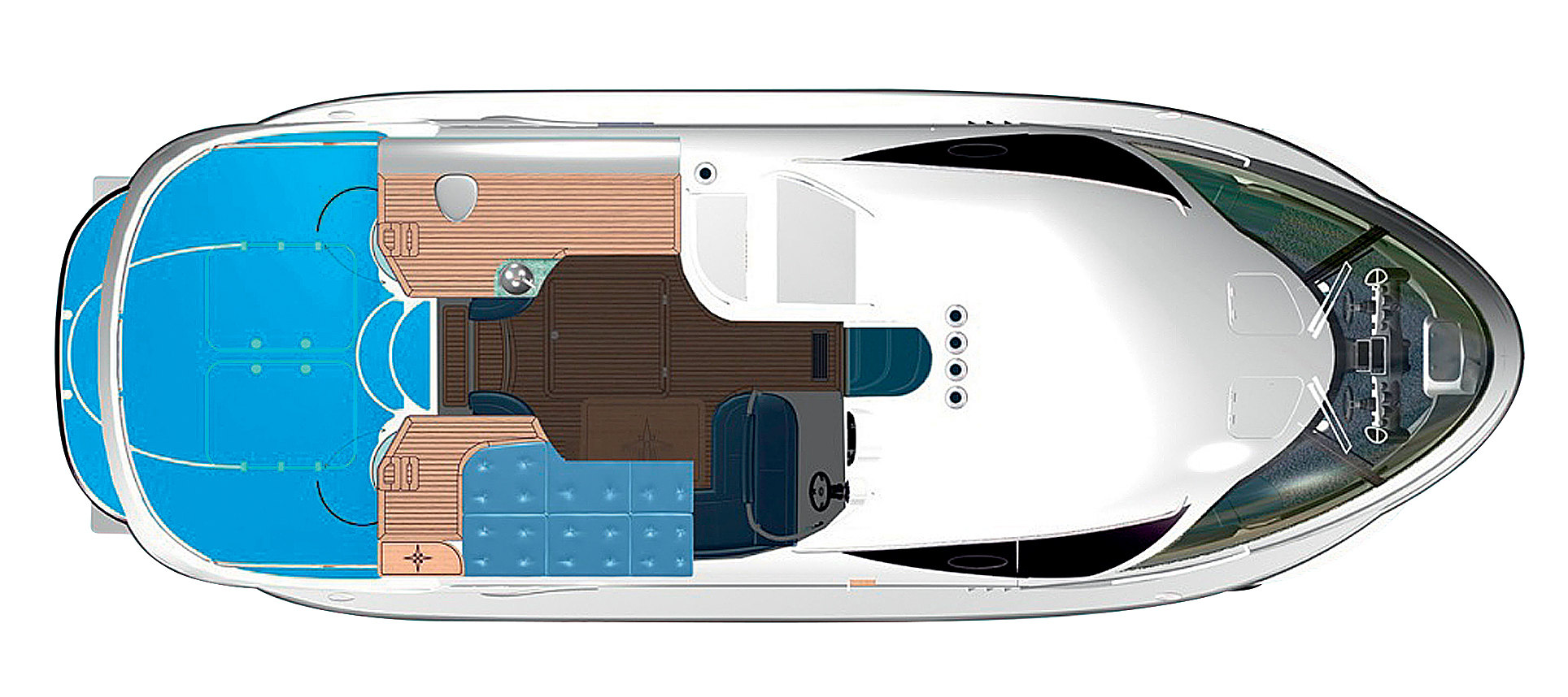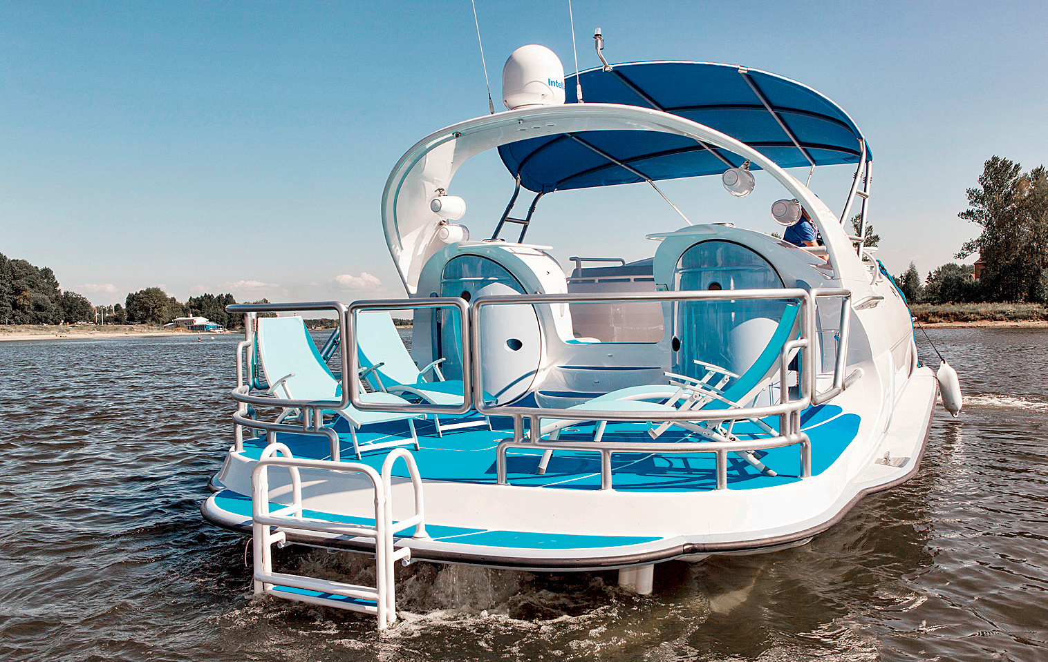 Александр и Владислав часто называют свои суда лодками, однако надо понимать, что по размеру обычным моторным лодкам с «лукерами» не тягаться. Длина яхты 13,4 м (44 фута), ширина — 4 м. Судно отличает полуторная компоновка: на носу — салон, в центре — кокпит (он самый высокий), это открытое помещение, от солнца и дождя его защищает тент. Здесь можно удобно расположиться на мягких диванах. Еще чуть ниже уровнем — просторная кормовая палуба, комплектуемая четырьмя шезлонгами.