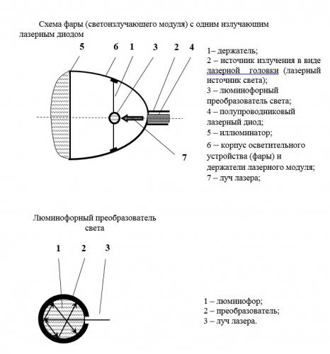 В корпусе каждого лазерного источника света могут быть расположены один или несколько источников лазерного излучения мощностью порядка 1 Вт каждый. Лучи направляют при помощи системы зеркал на элемент из флуоресцентного материала. При поглощении последним энергии выделяется белое свечение, из которого формируется световой пучок.