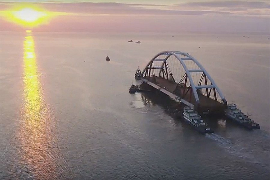 | Cегодня, 12 октября, начнётся подъем плавучих арок на проектную высоту в 35 метров. До этого плавучие опоры доставили автодорожный арочный пролет Крымского моста в створ между фарватерными опорами к 19:30. |