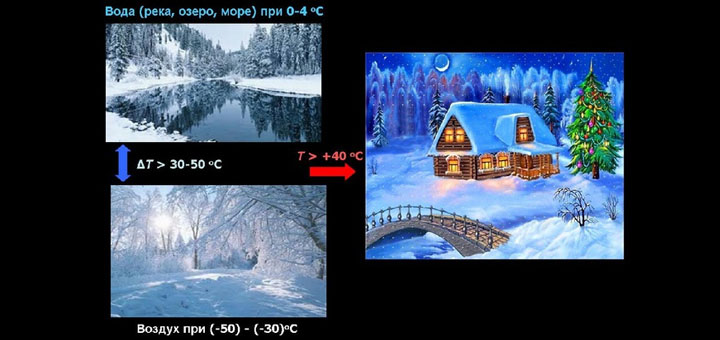 «Используя зимой два природных термостата (резервуара тепла), например, окружающий воздух и незамерзающую воду из реки, озера, моря или грунтовые воды, с разницей температур 30-60 °C, можно получить теплоту для обогрева домов. Причем чем холоднее на улице, тем легче получить полезное тепло», — рассказал Юрий Аристов.