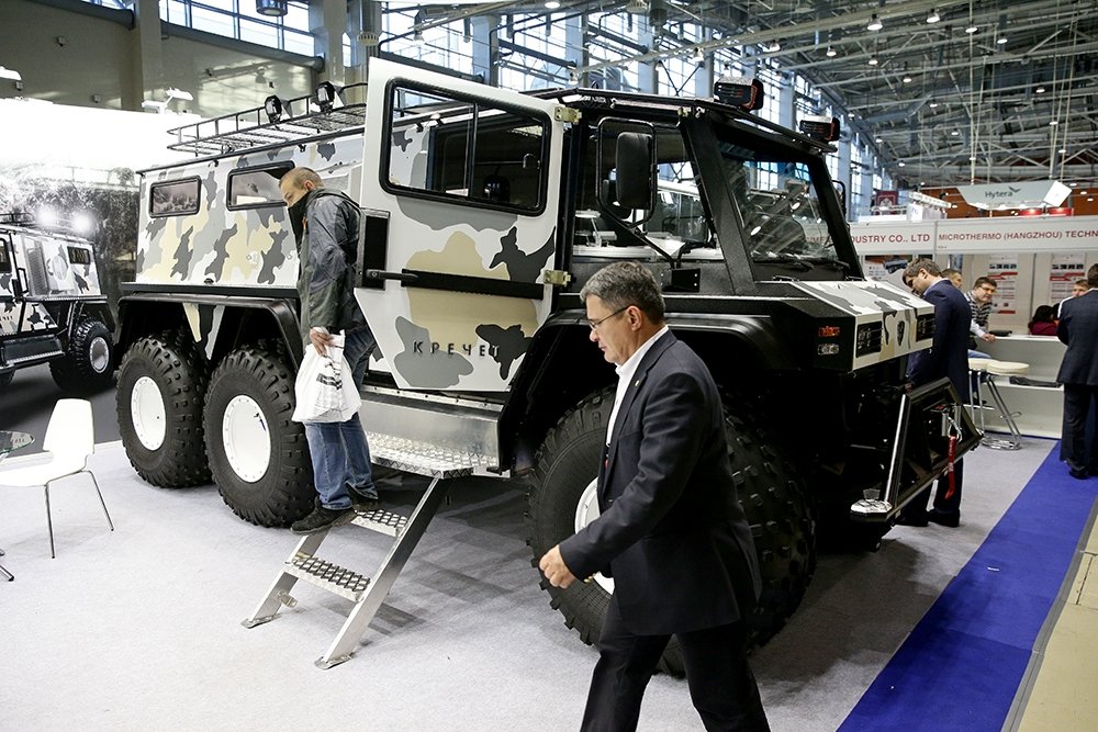 3. Вездеход «Кречет» Z 310-91 сделан в Тюмени и в общем-то рассчитан на суровые таежные и тундровые условия. Колесная формула — 6х6. Может вместить 11 человек. Рабочий объем двигателя — 2,476 л. Пройдет везде, в грузопассажирской кабине можно жить, как в вагончике, — тепло и удобно. Но без брони, поэтому относительно легкий — 2675 кг. Стоит он 6 миллионов рублей.