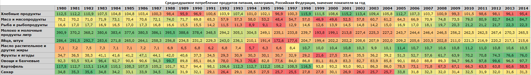 На самом деле прозводство в РСФСР не отражало потребление мяса. Моя таблица составлена на основе данных по потреблению ростата http://www.gks.ru/dbscripts/cbsd/dbinet.cgi?pl=2340015 , по опросам домохозяйств