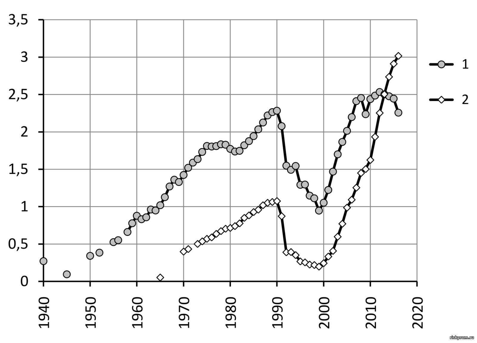 Рис. 2- 18. Производство мясных изделий в РСФСР и РФ, млн т: 1 – колбасные изделия; 2 – мясные полуфабрикаты