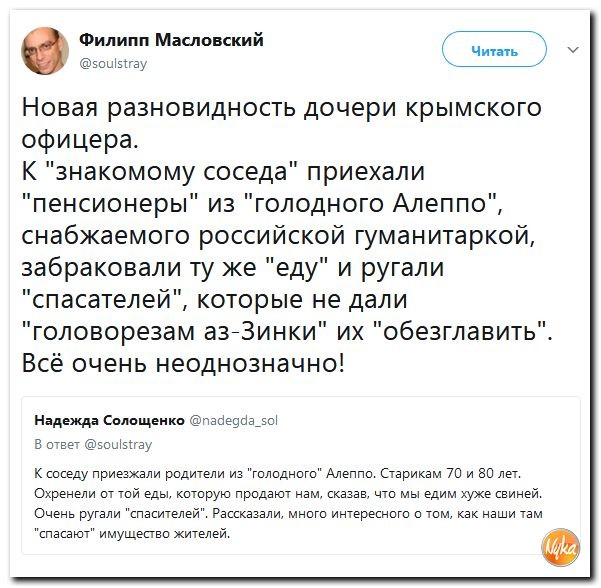 Военными ведомствами в торжественных мероприятиях! Вы поняли? Пока в Сирии уничтожаются наши самолеты, пока на Донбассе псковско-бурятские орды еле-еле держутся и уже массово сдаются Великой Украинской Армии Петра «Кондитер-Фюрера» Порошенко — эти придумывают и придумывают поводы на что распилить деньги несчастных пенсионеров! Ведь, например, все знают, что путинские ржавые ракеты не летают — зачем это вранье?