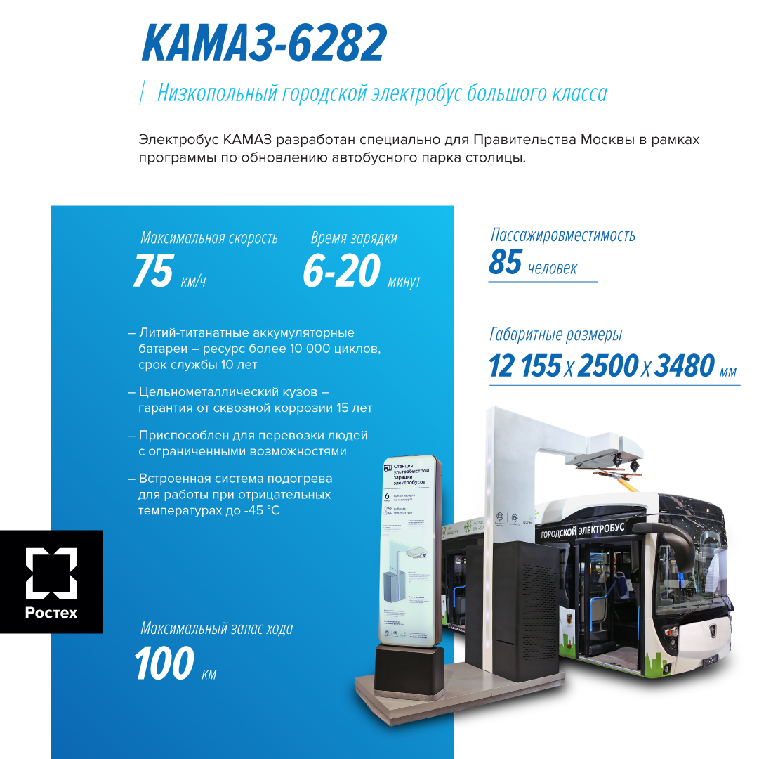 В августе этого года правительство Москвы приняло решение о замене дизельных автобусов в наземном общественном транспорте на электробусы. Подобная техника производства КАМАЗа уже успешно проходит опытную эксплуатацию на улицах столицы. Сегодня электробус КАМАЗ-6282 полностью готов к запуску в серийное производство и отвечает всем требованиям, предъявляемым к городскому электротранспорту.