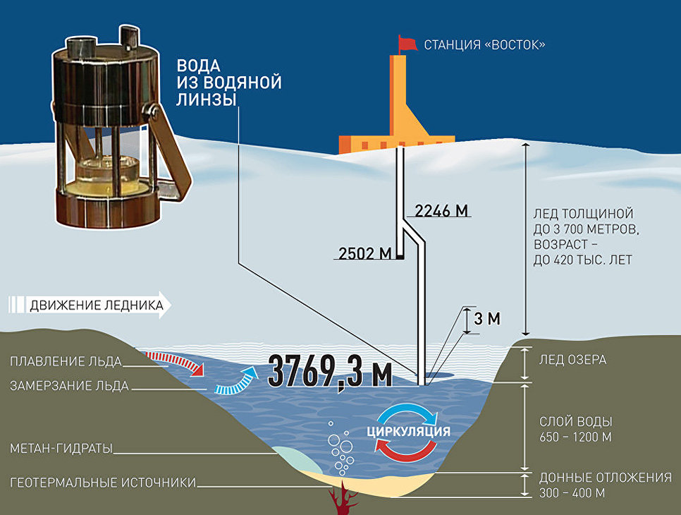 К этому моменту на станции «Восток» уже работала буровая скважина 5Г. Закладывая ее, полярники, разумеется, не знали о том, что у них под ногами находится последнее «белое пятно» на планете. Они хотели достать лед с разных глубин и реконструировать по содержащимся в нем газовым и твердым включениям климат прошлых эпох. Скважину заливали смесью керосина с фреоном, которая не замерзала и позволяла сдерживать горное давление. Фреон же к тому времени был признан опасным для атмосферы и запрещен, согласно Киотскому протоколу. На этом основании, а также опасаясь загрязнения озера химикатами и микроорганизмами с поверхности, международное научное сообщество запретило России бурить дальше и рекомендовало разработать более чистую методику. Скважину 5Г законсервировали в феврале 1998 года, когда до озера оставалось около 130 метров льда.