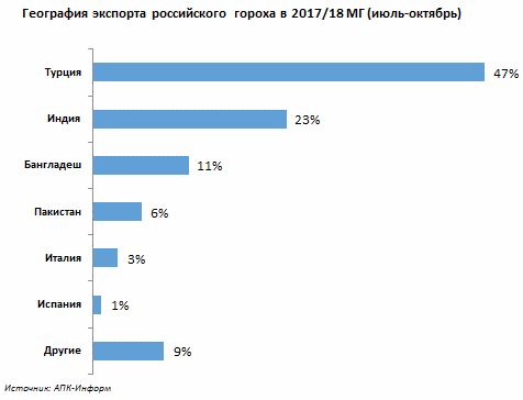 География поставок российского гороха представлена преимущественно странами Ближнего Востока, Южной Азии и ЕС. Крупнейшими покупателями российского гороха являются Турция (47% от объема экспорта за 4 месяца сезона-2017/18) и Индия (23%). Заметно оживился экспорт в Бангладеш.