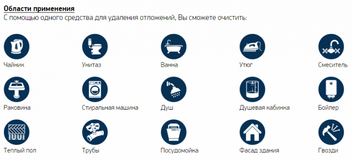 С помощью средства можно очистить от минеральных отложений (накипи) и ржавчины ванну, раковину, унитаз, смесители, керамику, инструменты и бытовую технику с нагревательными элементами — чайник, утюг и так далее. По оценке специалистов ИХТЦ, его эффективность в семь раз выше аналогов, которые продаются на полках в розничных сетях при стоимости в 1,5-2 раза ниже.