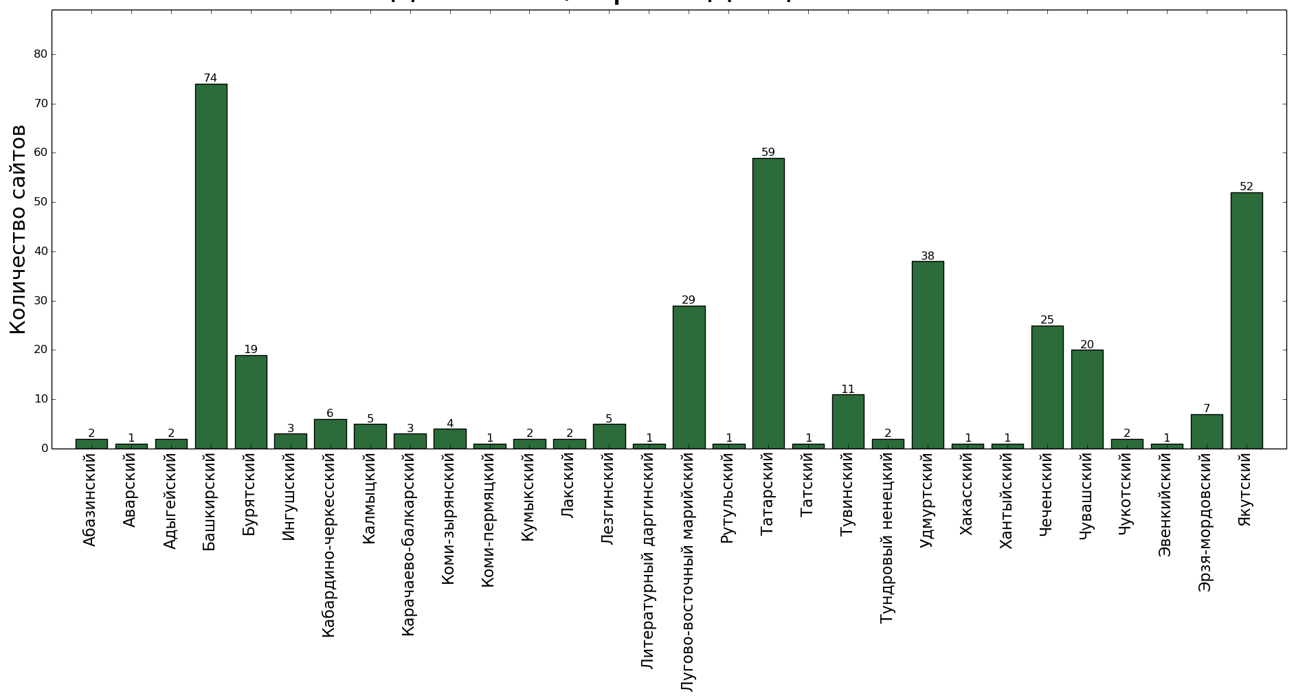 В результате мы получили списки сайтов и сообществ в VK.com. Сейчас эти списки уже устарели: какие-то сайты пропали, какие-то добавились, гораздо интенсивнее происходит жизнь в vk.com. Но по состоянию на начало 2016 года это довольно правдивая информация о том, как устроен Интернет на малых языках России.